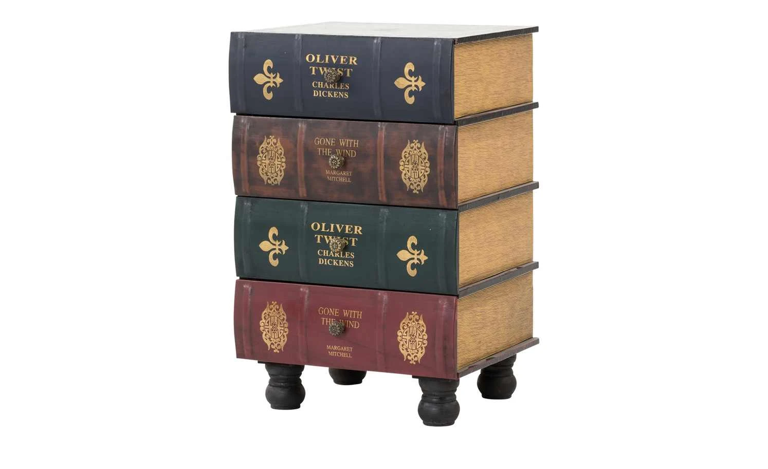 Das antiquarische Bücher-Design macht den besonderen Charme dieser Kommoden-Serie aus. Die mehrfarbige Kommode bringt einen ausdrucksstarken Kolonialstil in Ihre Wohnräume. Mit dieser gedeckten und harmonischen Farbgestaltung strahlt die Kommode Ruhe und Gemütlichkeit aus. Sie bietet ausreichend Stauraum für viele Kleinigkeiten, welche geschlossen und geschützt aufbewahrt werden sollen. Die 4 Schubladen der Kommode sind jeweils von gleicher Größe und mit nostalgischen Ornamenten, sowie einem mittig platzierten Schriftzug verziert. Die Kommoden Oliver Twist sind ein Hingucker und bringen das gewisse Etwas in Ihre Raumgestaltung.