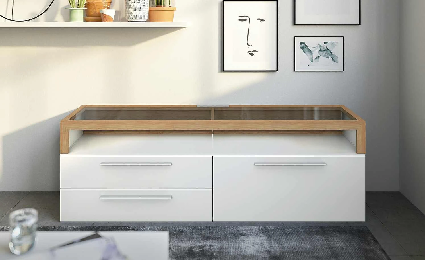 - Mehr zum Material: Material sichtbare Rückwand: Holzwerkstoff furniert, Material Absetzung: Massivholz, Material Deckplatte und Stützwange: Glas
