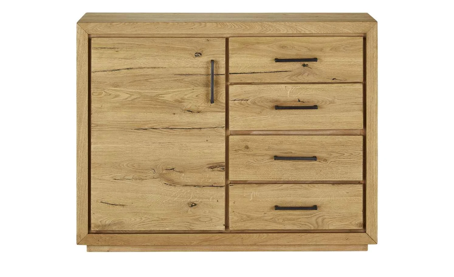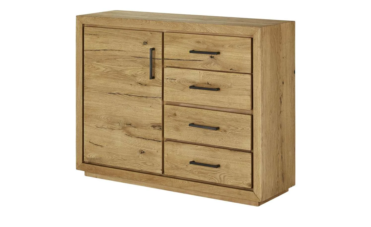 Stauraum für Wohnzimmer oder Essbereich, den bietet die Kommode Black Coast One von Gray & Jones. Links steht Ihnen eine Tür mit zwei Fächern dahinter zur Verfügung. Rechts hat die Kommode vier geräumige Schubladen. Dank der Soft-Close-Funktion schließen Tür und Schubladen langsam und leise. Black Coast ist mit Eichenholz furniert und zusätzlich lackiert worden. Für einen guten Stand ist der Sockel aus massiver Eiche gefertigt worden. Das Holz zeichnet sich durch seine Qualität und ausgeprägte Maserung aus.