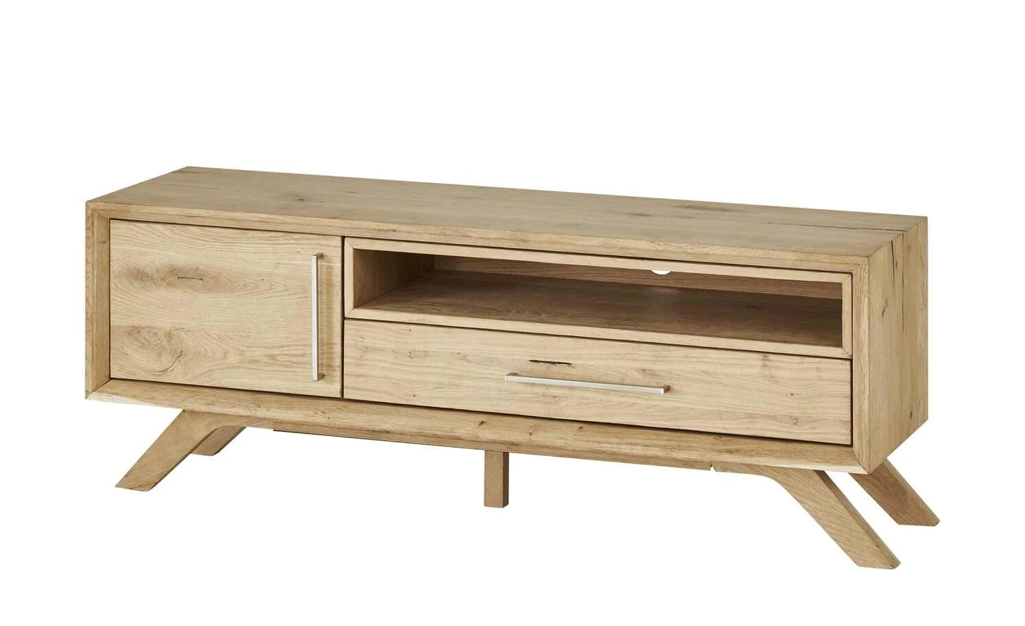 Das TV-Lowboard Cap Ferrat One hat ein natürliches Design mit Scandi-Charme. Es ist von der Marke Gray & Jones und besteht aus hochwertigen Materialien. So sind Front und Korpus mit Eiche furniert, für die Füße ist massive Eiche verwendet worden. Dank der unbehandelten Oberflächen kommt die holztypische Maserung wunderbar zur Geltung. Cap Ferrat One hat eine 150 cm breite Stellfläche für einen Fernseher. Das große Gerätefach ist mit einem Kabeldurchlass in der Rückwand ausgestattet. Stauraum befindet sich hinter Tür und in Schublade. Beide verfügen über eine Soft-Close-Ausstattung.