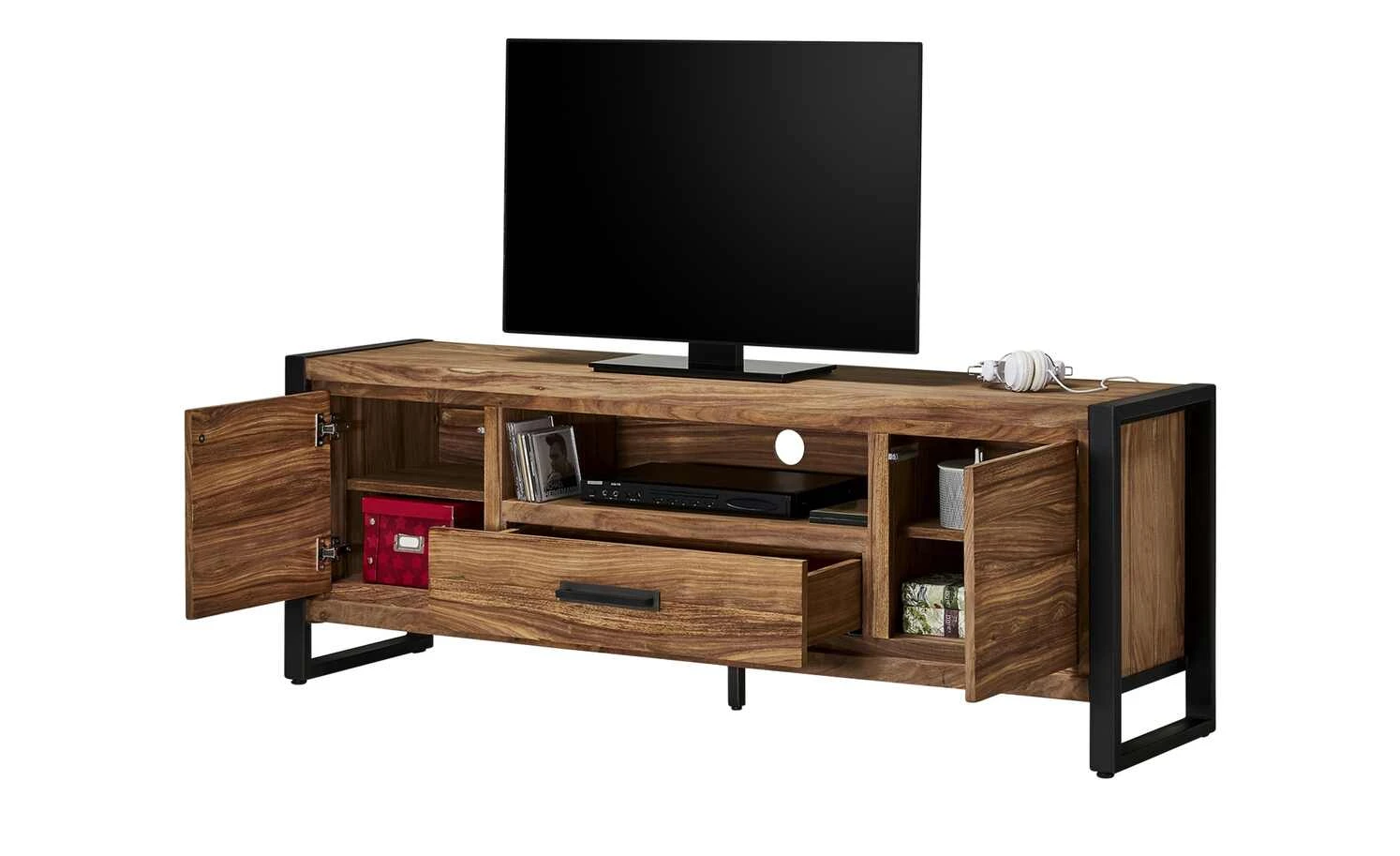 Setzen Sie Ihren Fernseher in Szene – und zwar auf dem TV-Lowboard Tierra Fuego One von Gray & Jones. Es hat einen angesagten Industrial-Look. Front und Korpus sind mit Sheesham furniert. Diese Holzart aus Indien zeichnet sich durch ihre auffällige Maserung aus. Als Kontrast zum natürlichen Flair ist das Gestell aus schwarzem Eisen gefertigt, was den Factory-Style zur Geltung bringt. Mittig hat das Lowboard ein Gerätefach mit einem Kabeldurchlass in der Rückwand. Für Stauraum ist auch gesorgt: Tierra Fuego One verfügt über zwei Türen mit Push-to-Open und eine Schublade mit Soft-Close-Ausstattung für leises Schließen.