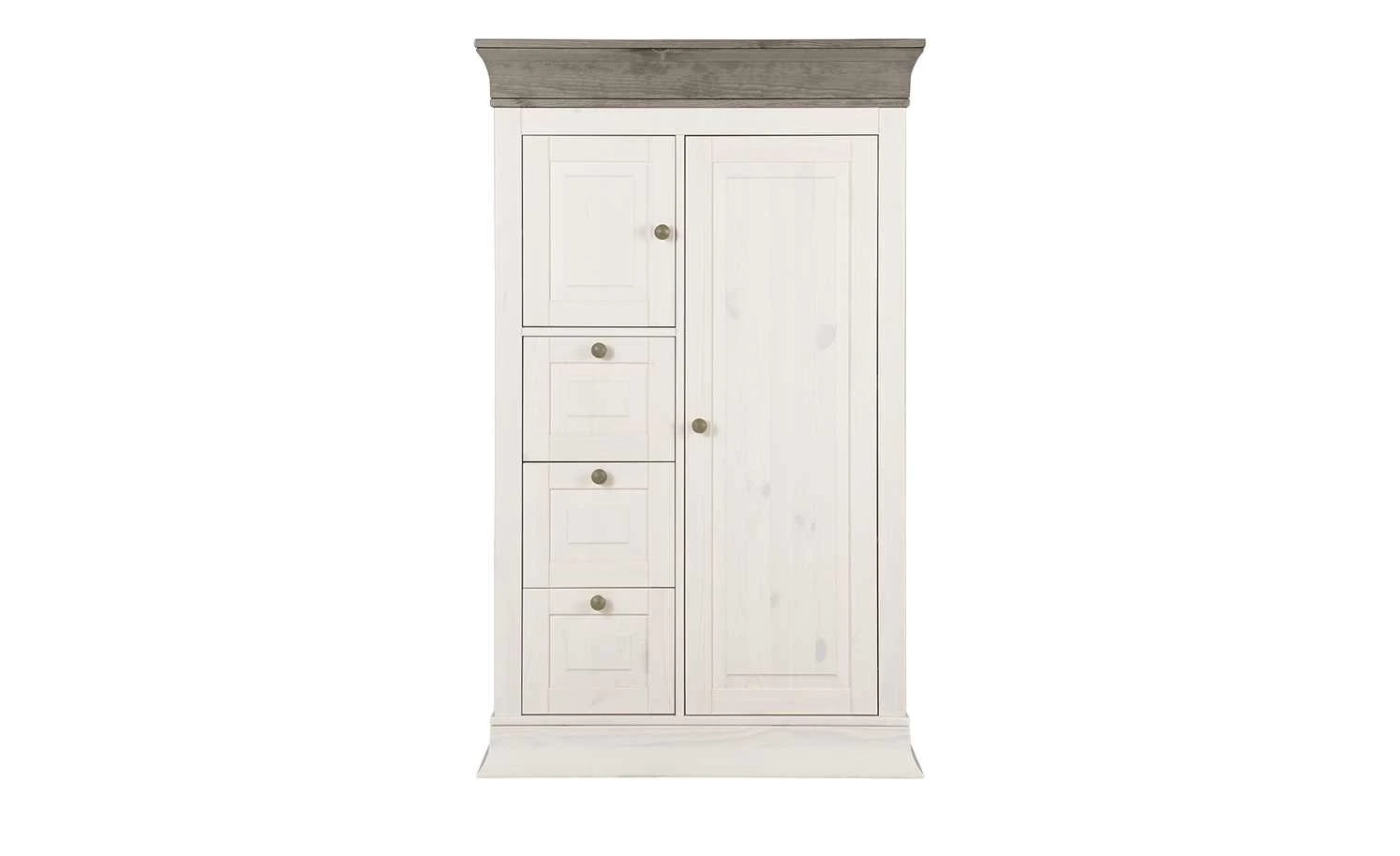 Das Highboard Bornholm ist einem klassischen Brotschrank wie zu Großmutters Zeiten nachempfunden. Der Brotschrank ist aus massiver Kiefer gefertigt worden und somit robust und langlebig. Durch das helle Weiß, bei dem die Holz-Maserung gut erkennbar ist, und die dekorativen Absetzungen in lavafarben lackierter Kiefer erhält Bornholm ein nostalgisches Landhaus-Flair. Dieses wird durch den geschwungenen Sockel und Kranz und die formschönen Einfräsungen an den Fronten geschmackvoll unterstützt. Auf der rechten Seite finden Sie vier große Fächer hinter einer Drehtür. Auf der linken Seite befinden sich drei praktische Schübe und ein weiteres Fach mit Tür. So haben Sie ausreichend Platz für Alltagsutensilien, Geschirr und vieles mehr.