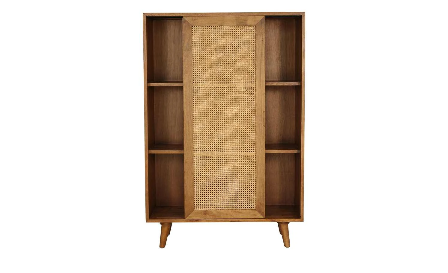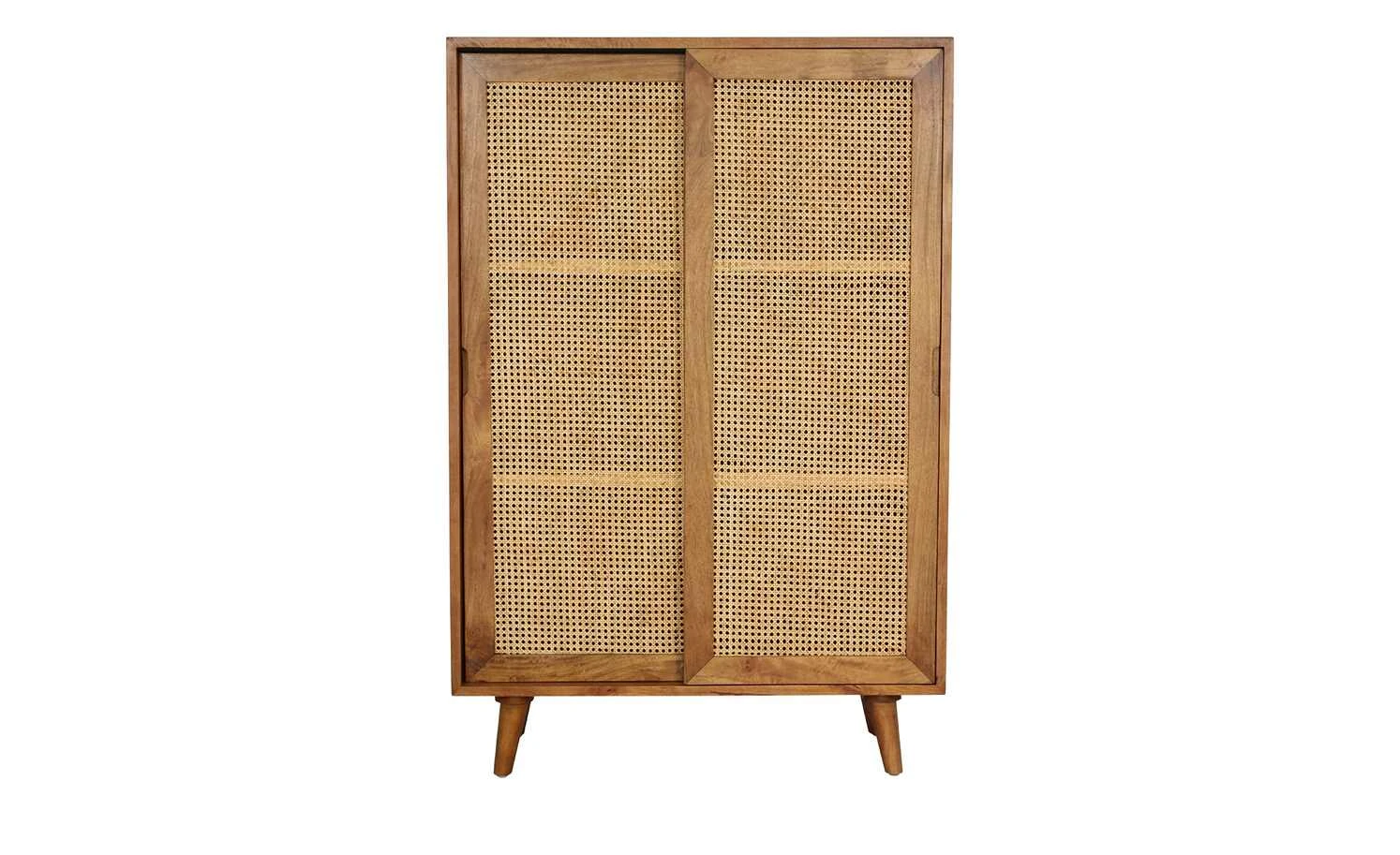 Die Serie Tweed Me entführt Sie in längst vergangene Zeiten und bringt Wiener Eleganz in Ihre vier Wände. So auch das Highboard aus Mango-Massivholz, welches für den Korpus und die Füße genutzt wurde. Farblicher Kontrast zu dem schön gemaserten Holz sind die beiden Schrankfronten. Diese wurden aus natürlichem Rattan zu einem edlen Achteck-Muster geflochten, welches auch als Wiener Geflecht bekannt ist. Die vier konischen, schräg zulaufenden Massivholzfüße runden das Gesamterscheinungsbild gekonnt ab.