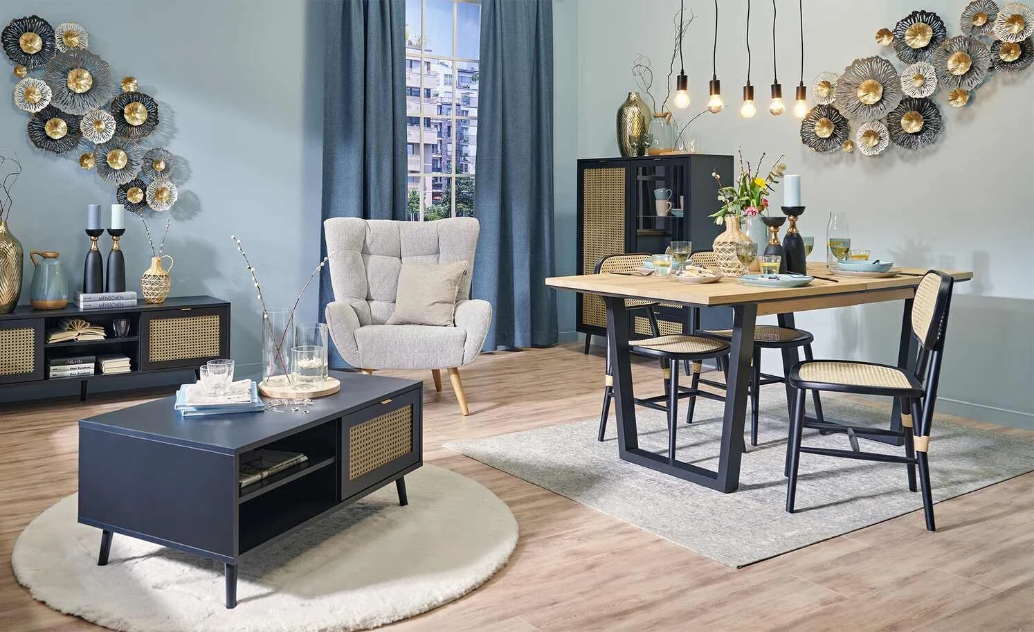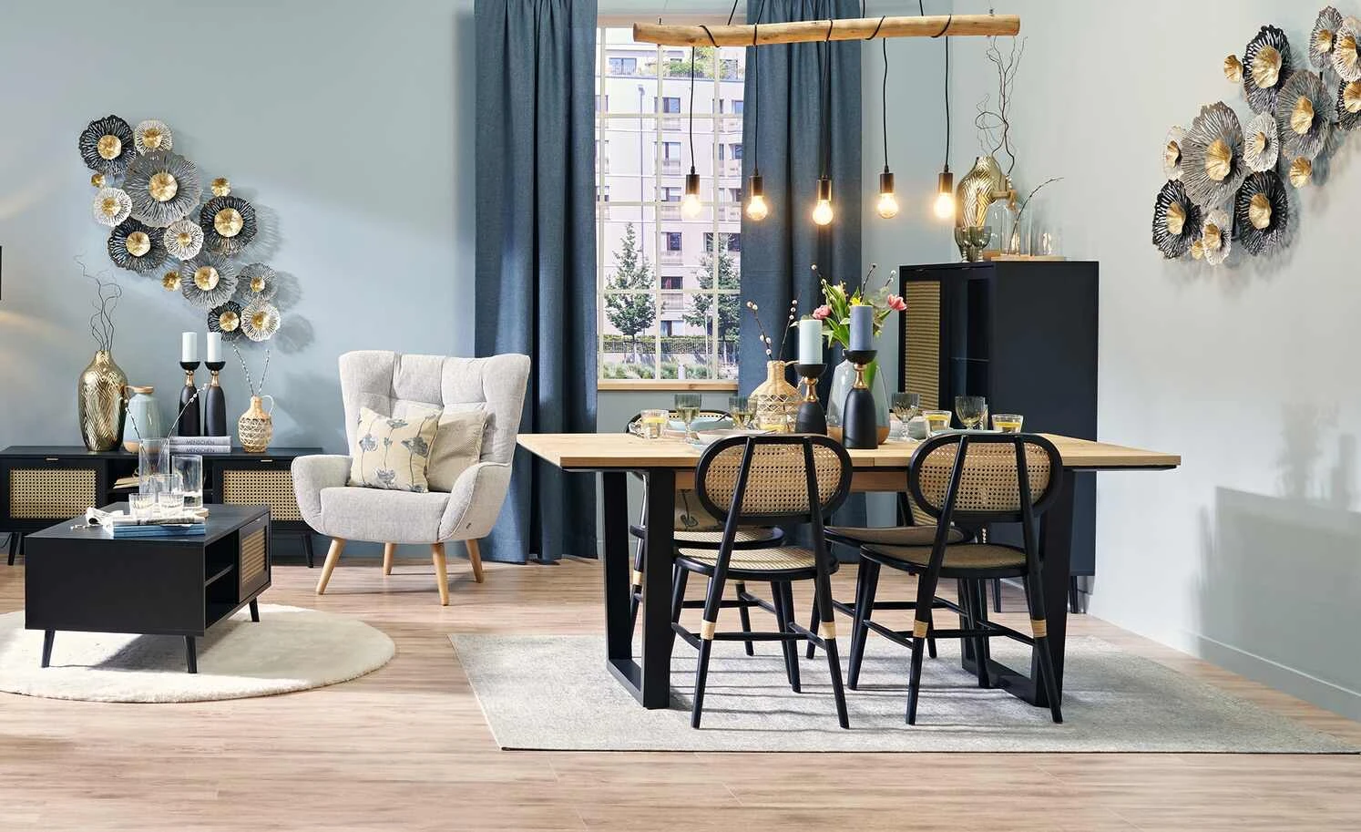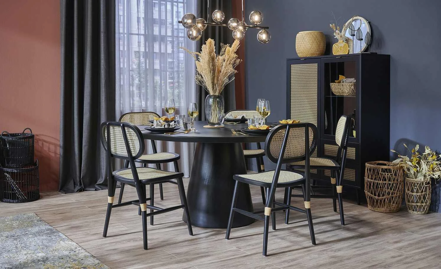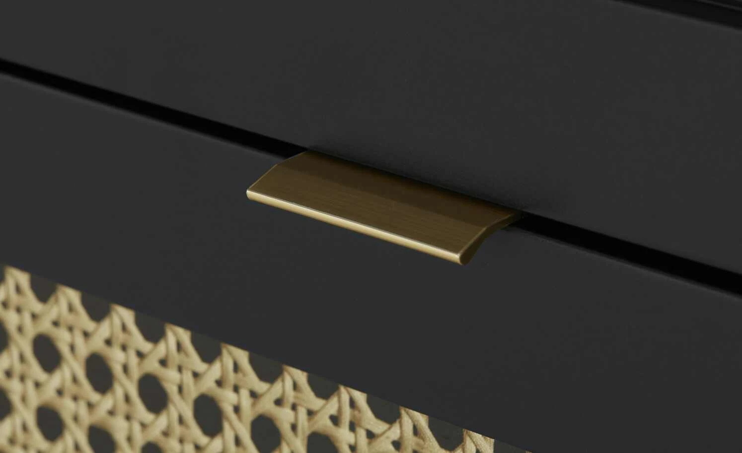 Das Highboard Vienna überzeugt mit seinem attraktivem Retro-Flair. Der überwiegend schwarze Schrank besitzt nämlich die serientypischen Fronten in Wiener-Geflecht-Optik. Der authentisch wirkende Fotodruck setzt einen hellen Kontrast und imitiert das beliebte, achteckige Geflecht gekonnt. Auf der rechten Seite des Highboards befindet sich eine Vitrinentür, hinter der Sie auf zwei Etagen Ihre liebsten Stücke in Szene setzen können. Vier messingfarbene Griffe komplettieren das Design.