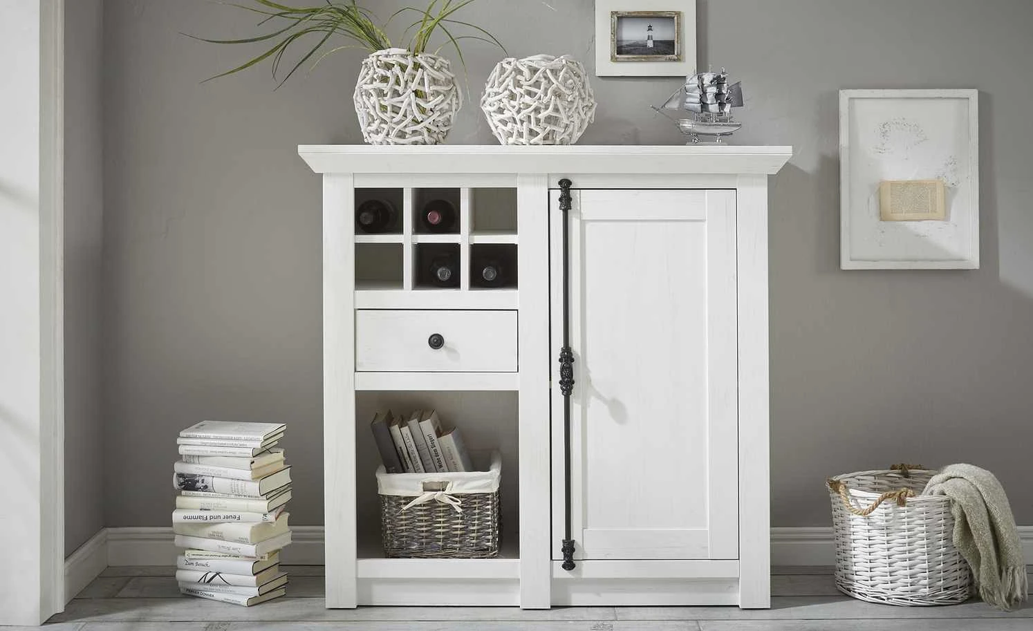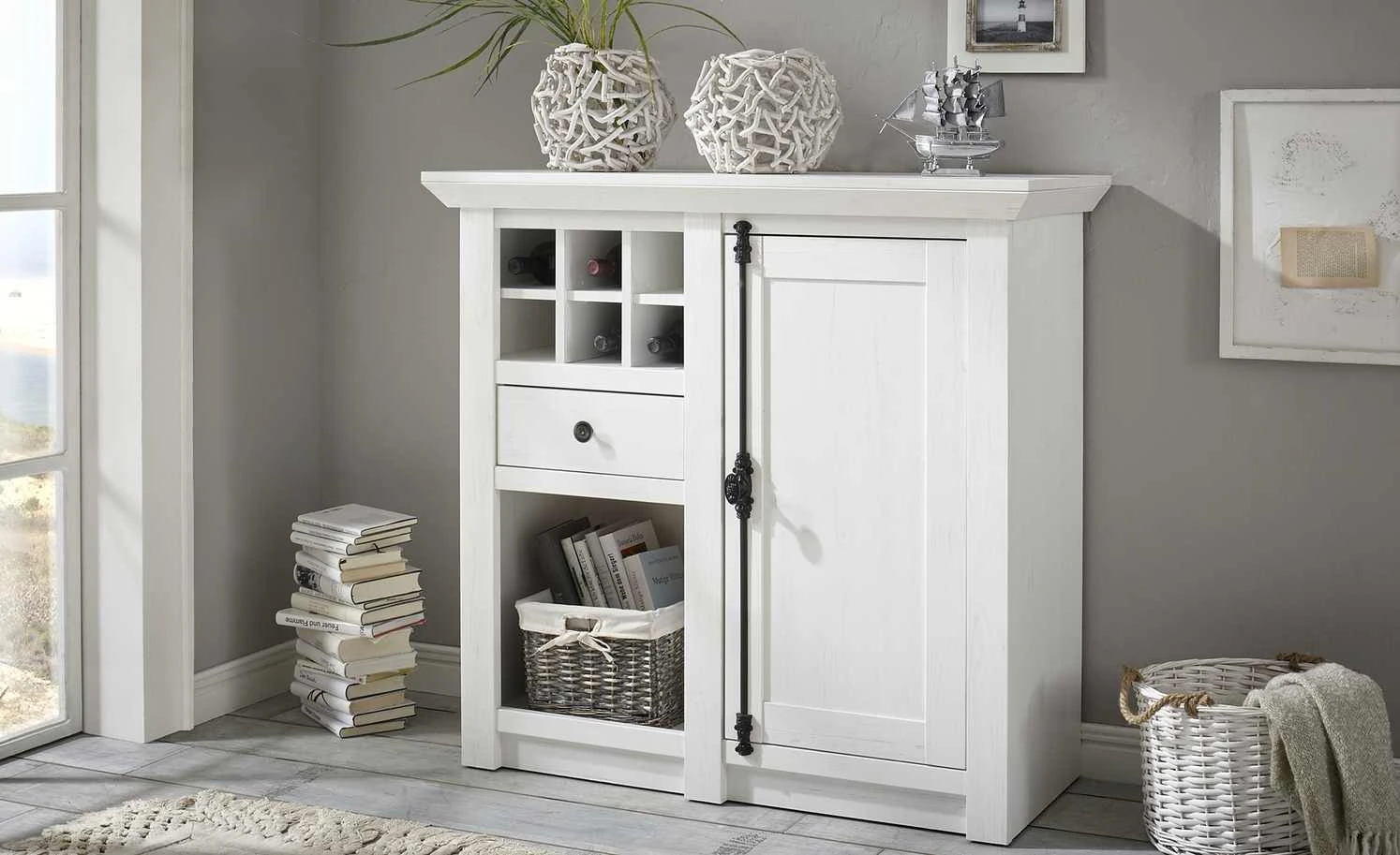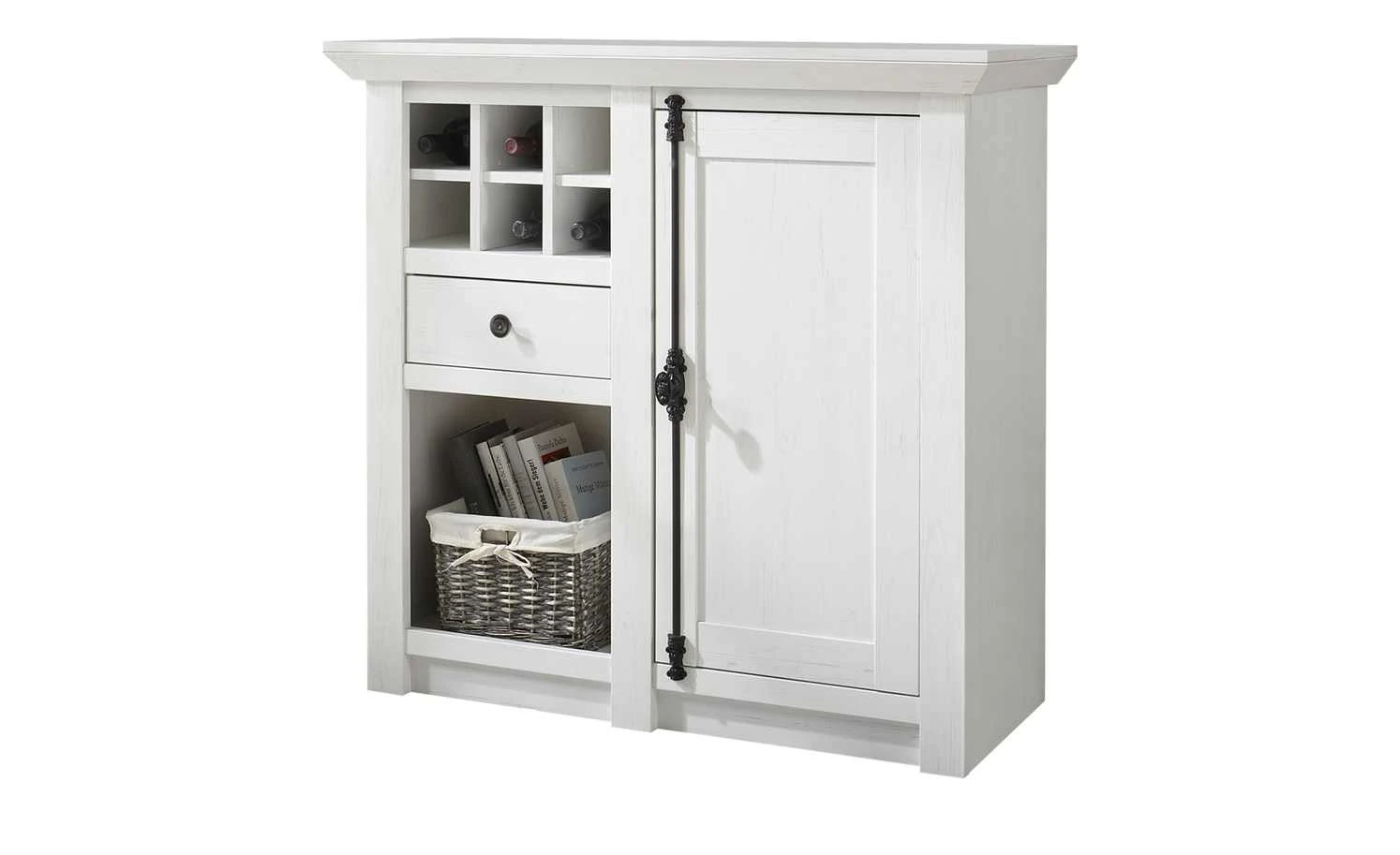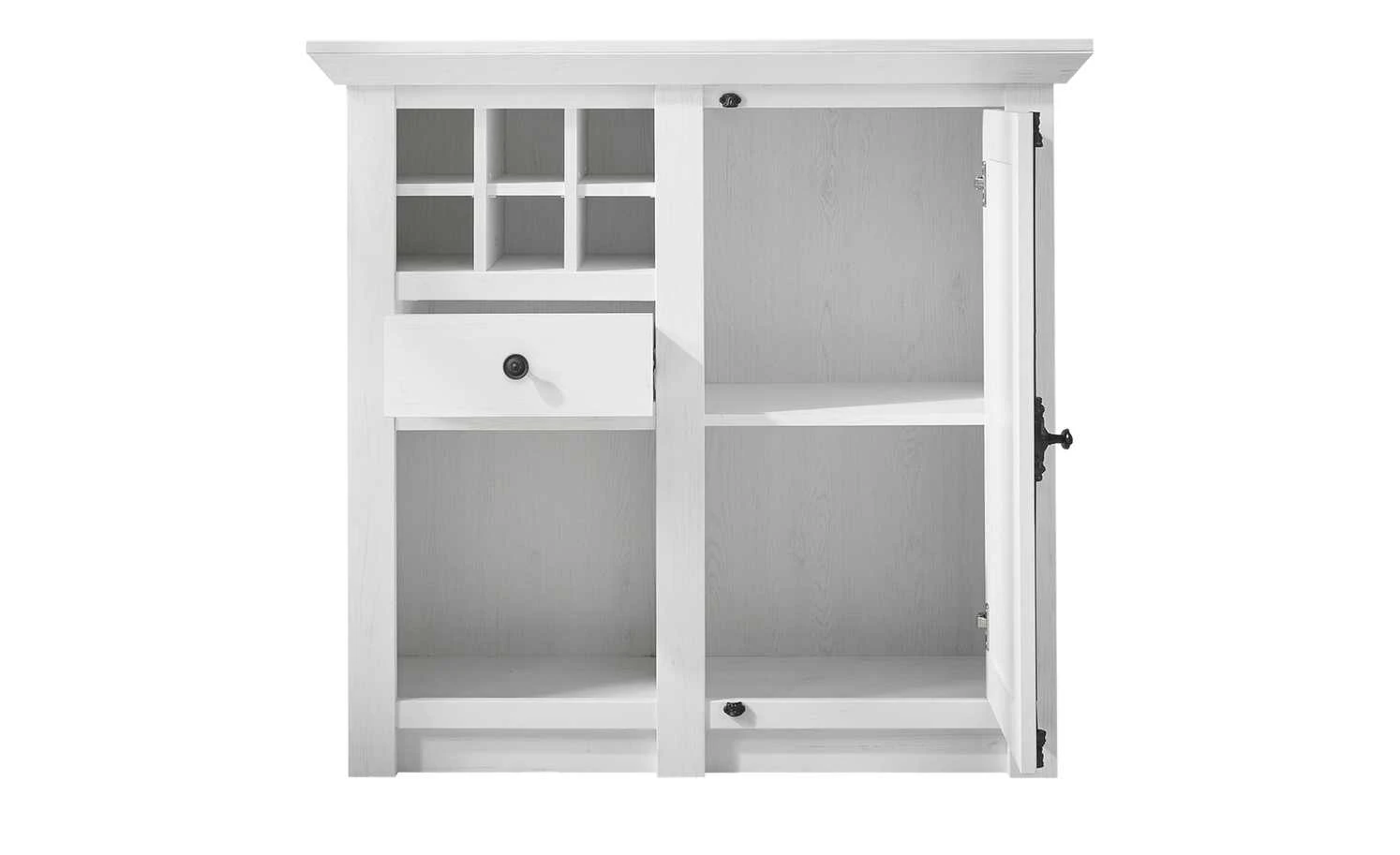 Machen Sie die Kommode Atina zum Highlight Ihres Wohnraumes. Sie ist im attraktiven Landhausstil designt – und ist dazu auch noch praktisch. Das Dekor in Pinie Weiß (Nachbildung) verfügt über eine schöne Maserung und harmoniert perfekt mit dem Landhausstil. Ein Eyecatcher ist der Griff. Er ist kunstvoll im Vintage-Look verziert und setzt Kontrastakzente. Atina verfügt über ein Weinregal mit Platz für sechs Flaschen. Direkt darunter sind eine Schublade und ein großes offenes Fach zu finden. Hinter der großen Tür rechts sind zwei große Fächer zu finden.