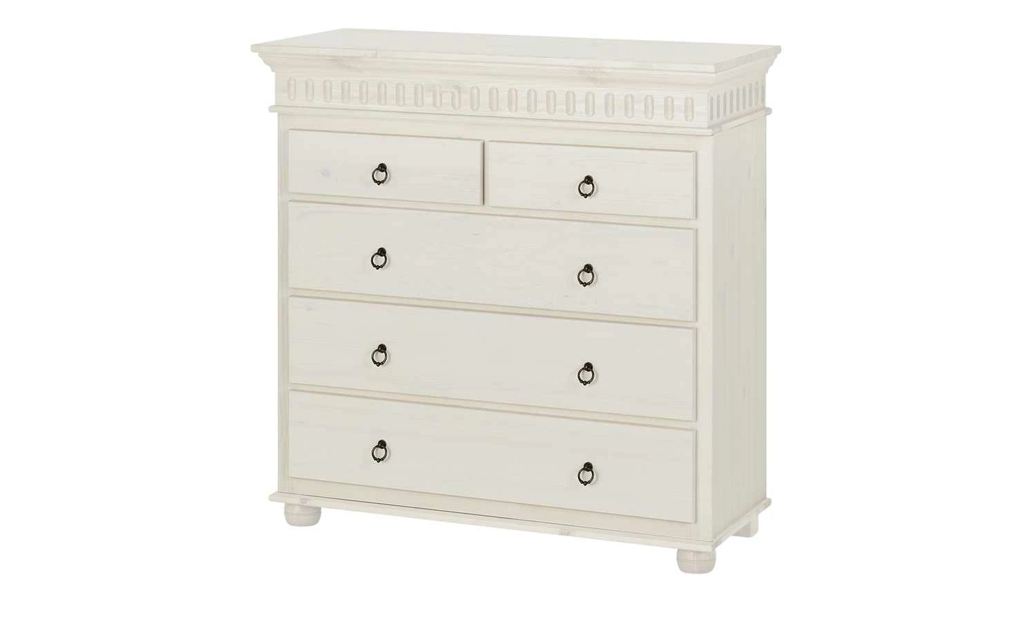 Der rustikale Landhausstil der Kommode Bornholm bringt Gemütlichkeit in jeden Raum. Sie können Bornholm alleine nutzen oder mit den anderen Möbeln der Serie kombinieren. Bornholm ist aus massivem Kiefernholz gefertigt. Es ist stabil und langlebig. Alle Oberflächen sind gewachst worden, wobei die holztypische Maserung dennoch wunderbar zu erkennen ist. Dekorative Griffe ergänzen den Gesamtlook der Kommode wunderbar. Bornholm verfügt über Stauraum in fünf Schubladen – zwei kleineren und drei größeren.