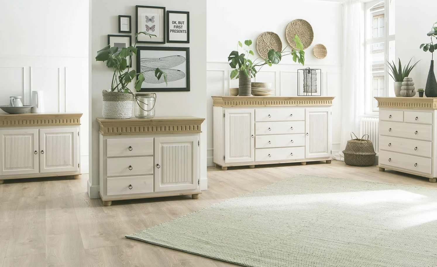 Der rustikale Landhausstil der Kommode Bornholm bringt Gemütlichkeit in jeden Raum. Sie können Bornholm alleine nutzen oder mit den anderen Möbeln der Serie kombinieren. Bornholm ist aus massivem Kiefernholz gefertigt. Es ist stabil und langlebig. Die weißen Flächen sind gewachst worden, wobei die holztypische Maserung dennoch wunderbar zu erkennen ist. Die Absetzungen in Kiefer antikfarben sind lackiert worden. Auch hier ist die Maserung wunderbar zu erkennen. Dekorative Griffe ergänzen den Gesamtlook der Kommode wunderbar. Bornholm verfügt über Stauraum in vier geräumigen Fächern hinter zwei Türen.