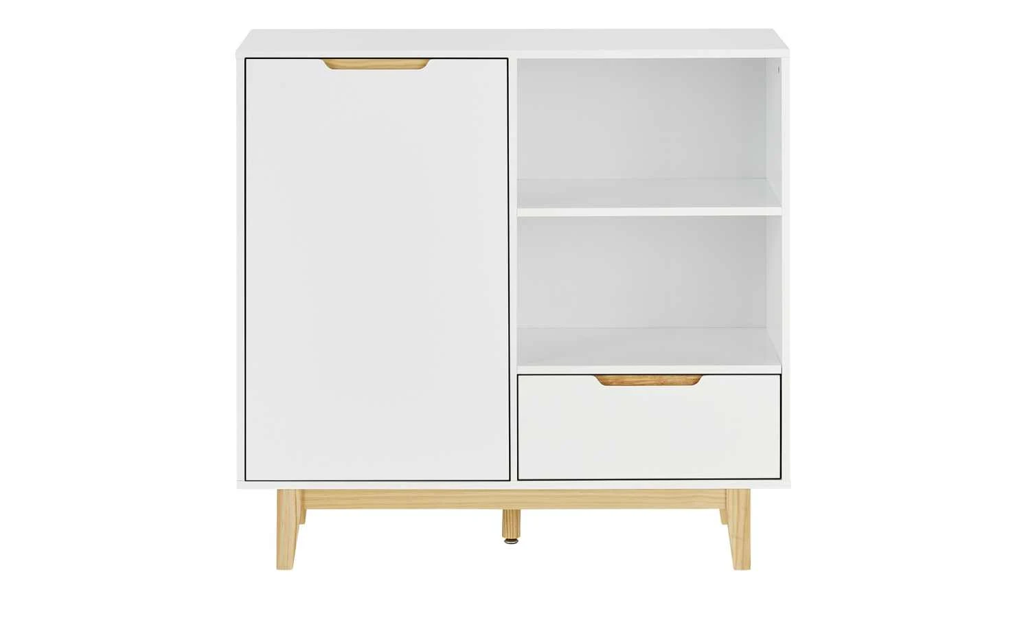 Vielseitigen Stauraum, den erhalten Sie mit der Kommode Brescia. Auf der linken Seite ist die Kommode mit einer Tür ausgestattet, hinter der sich zwei Fächer befinden. Rechts verfügt Brescia über zwei offene Fächer und eine Schublade. Brescia ist in Weiß designt und wird zusätzlich in Kiefer Natur abgesetzt. Die weißen Flächen sind ebenmäßig lackiert, während Gestell und Absetzungen aus massiver Kiefer bestehen.