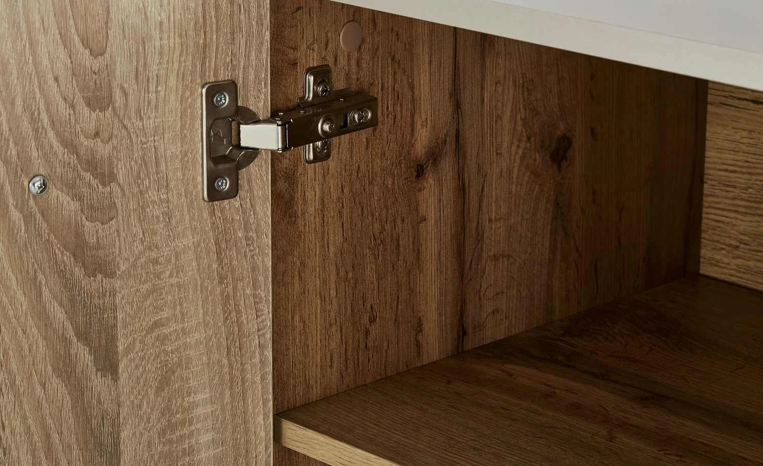 - Mehr zum Material: Material Rückwand und Böden: Holzwerkstoff foliert, Eiche Altholz (Nachbildung), Absetzungen: Holzwerkstoff foliert, Hirnholz (Nachbildung)