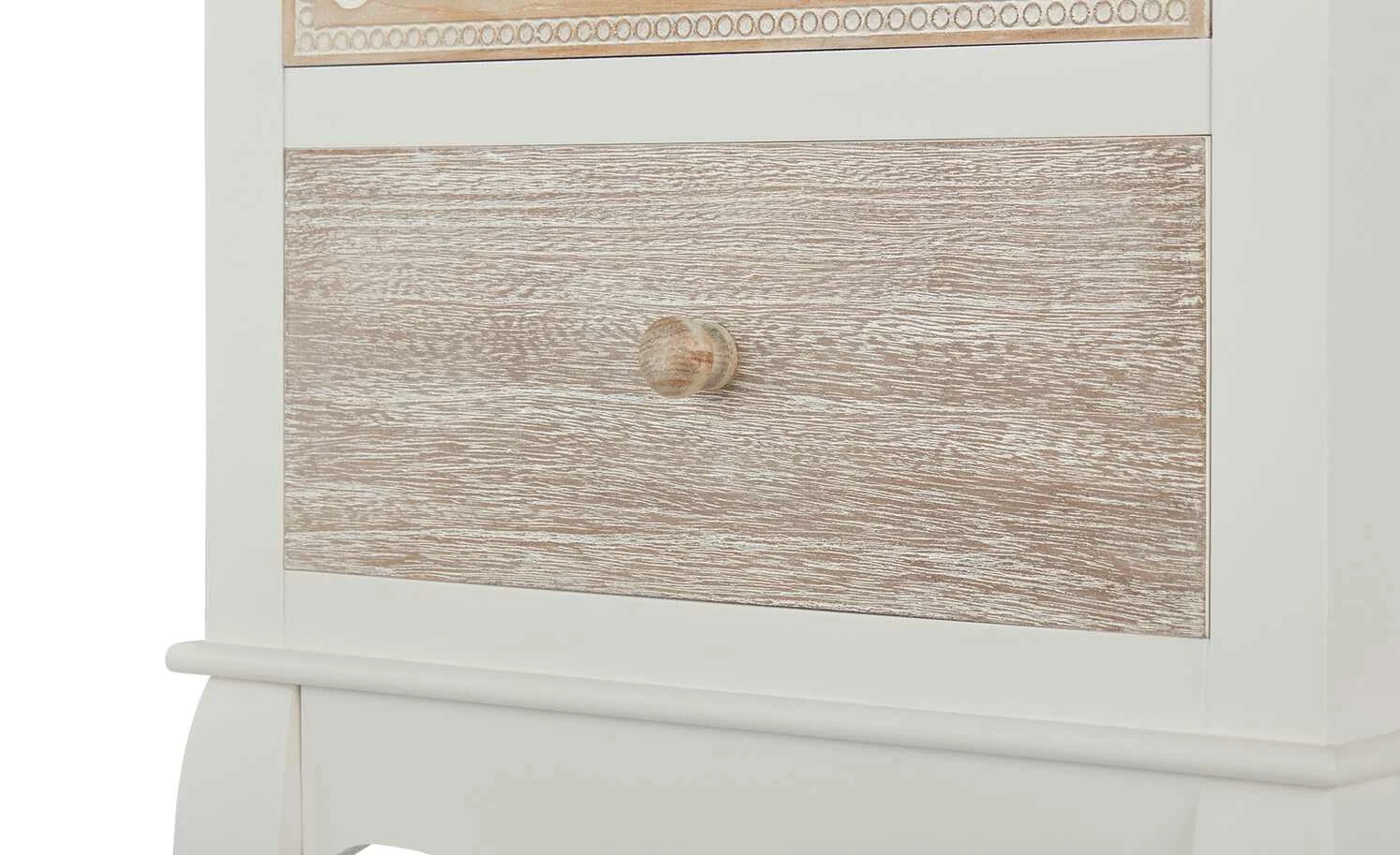 Die Kommode Foggia ist hübsch anzusehen und praktisch. Korpus und Füße sind weiß lackiert und werden durch natürliche Echtholzakzente abgesetzt. Die gebogenen Füße und die obere Schubladenfront mit ihren filigranen Schnitzereien bestehen aus massivem Kiefernholz. Die Abdeckplatte und das zweite Schubfach sind dagegen mit robustem Paulownia-Holz furniert. Die Kommode Foggia bietet Stauraum in zwei Schubladen.
