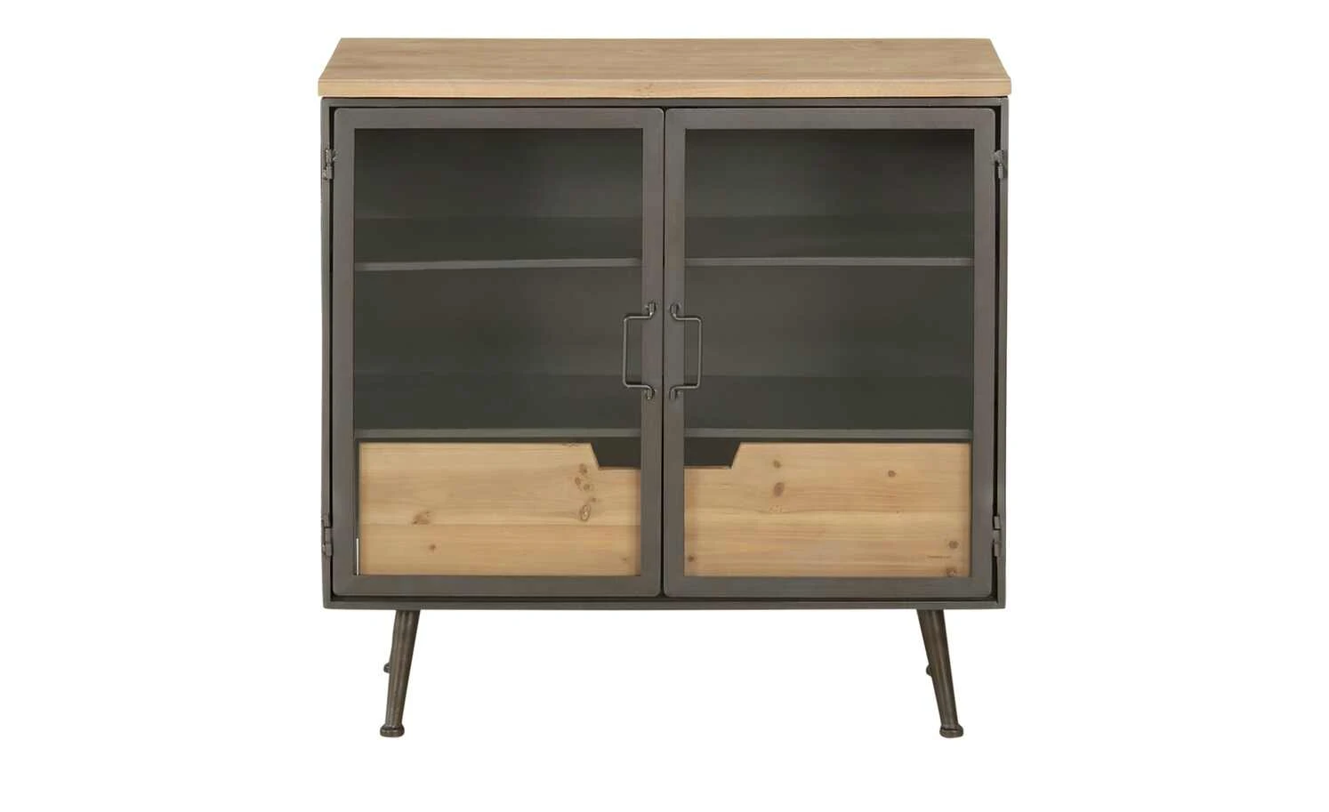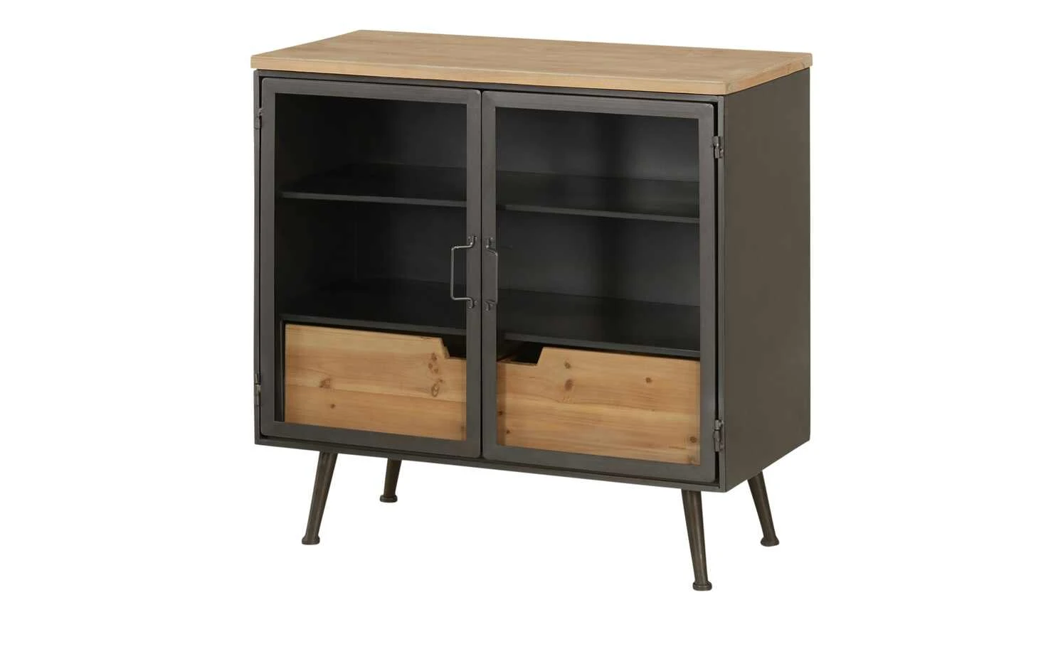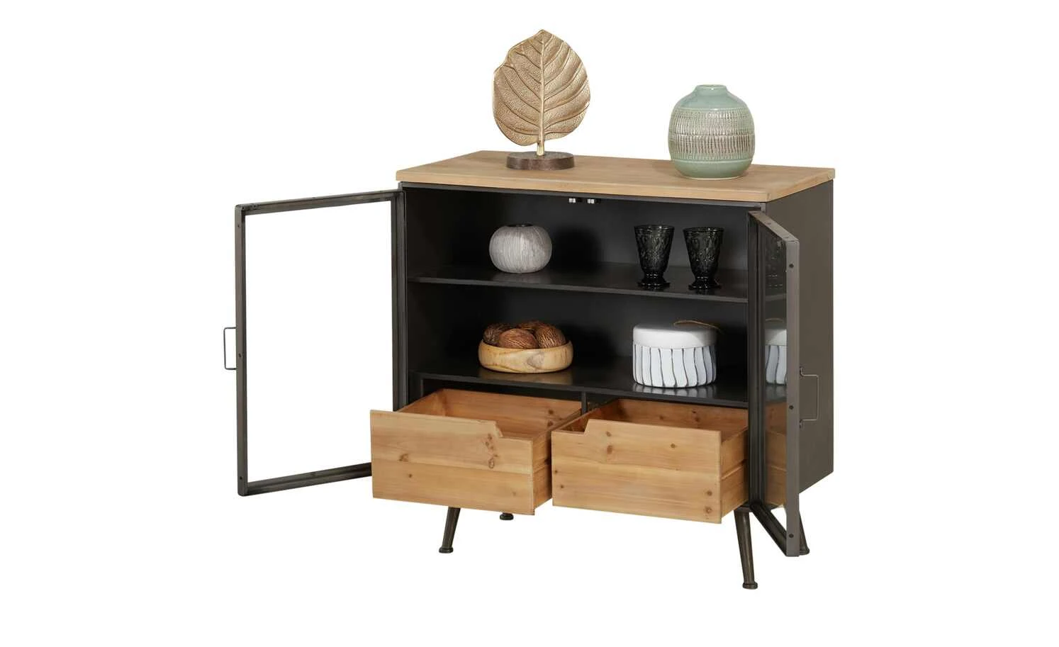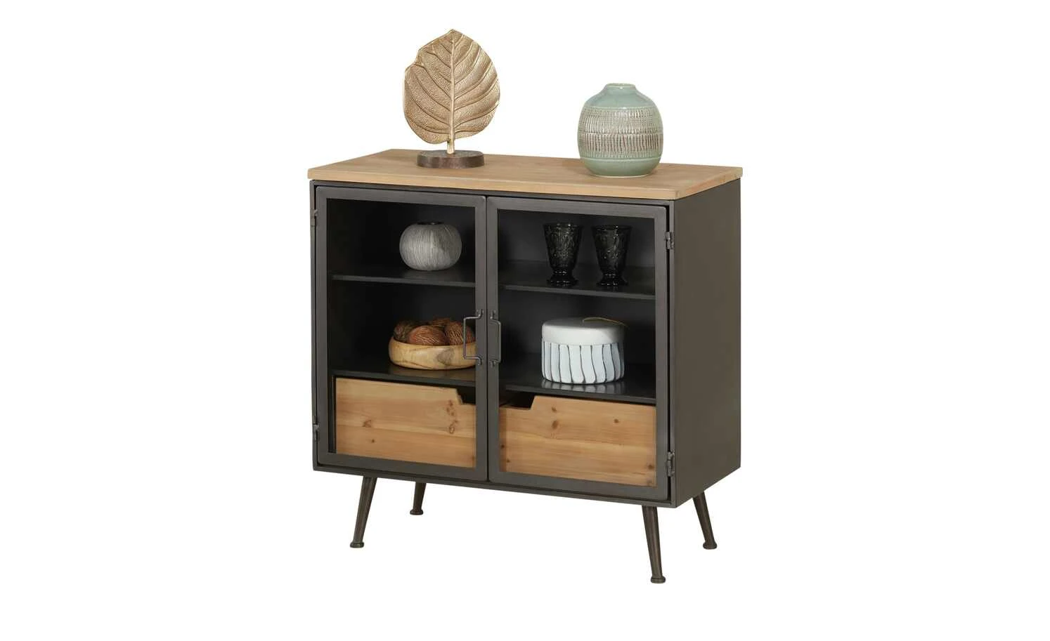 Massives Kiefernholz, dunkles Metall und Glas: Die Kommode Imola imitiert den beliebten Industrial-Look gekonnt. Attraktive Used-Effekte akzentuieren die charakterstarke Gesamtoptik. Durch die beiden Glastüren können Sie den Inhalt der Kommode wunderbar erkennen. Setzen Sie auf zwei Etagen dekorative Gegenstände oder besonderes Geschirr in Szene. Die zwei darunterliegenden Schubkästen heben sich durch das natürlich, schön gemaserte Kiefernholz bewusst vom schwarzen Korpus ab. Hier können Sie zum Beispiel Zeitschriften und Platzdeckchen blickdicht verstauen.