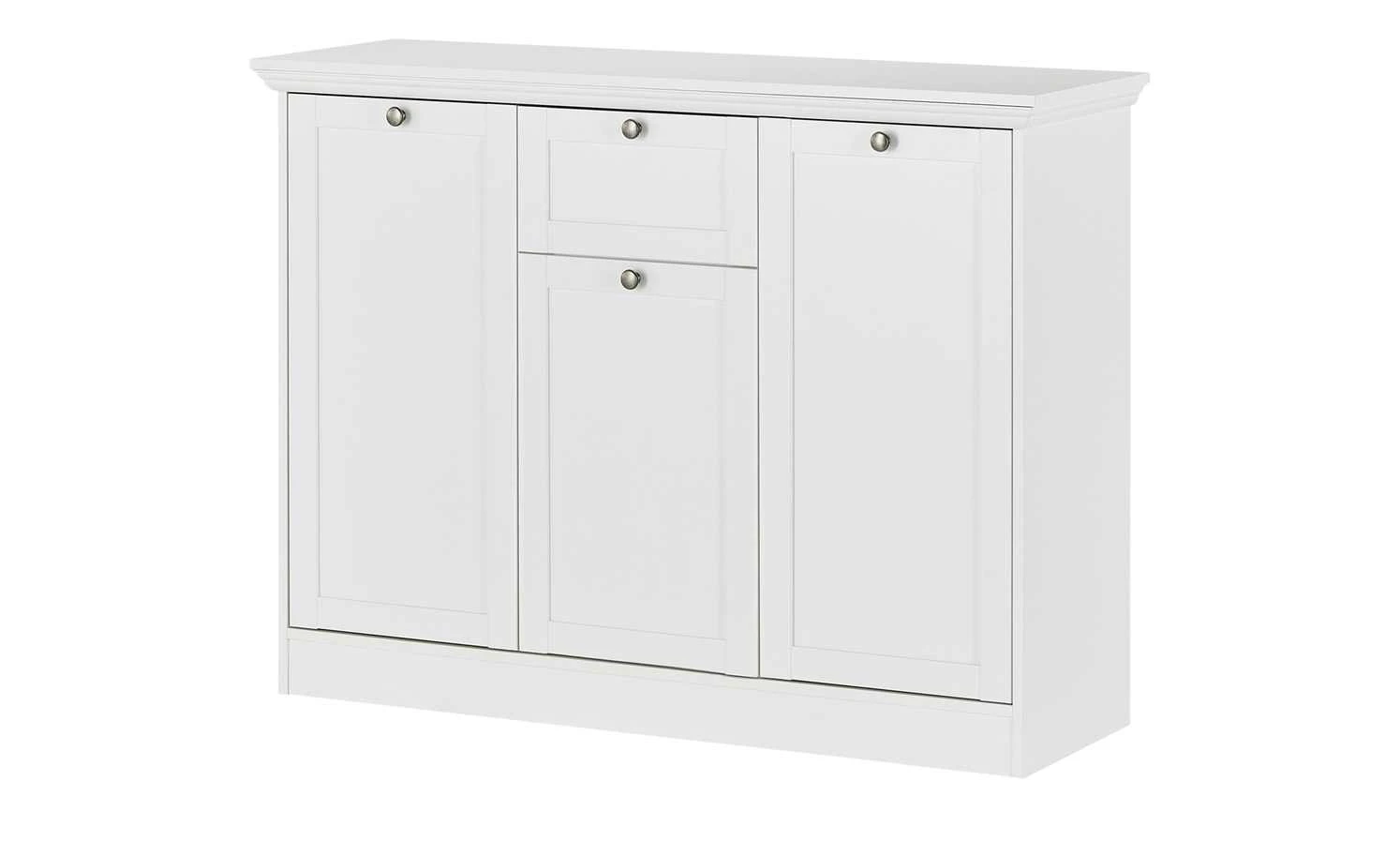 Die Kommode Laurito punktet mit ihrem hübschen Landhauscharme, der reduziert und elegant wirkt. Die feinen Linien werden mit einem strahlenden Weißton kombiniert. Metallgriffe im Vintagedesign setzen punktuelle Akzente – und sind natürlich auch praktisch. Laurito verfügt nämlich über drei Türen. Dahinter finden Sie fünfgeräumige Fächer mit höhenverstellbaren Einlegeböden. Zusätzlich steht Ihnen eine Schublade zur Verfügung. Die Oberflächen sind beschichtet, was sie strapazierfähig und pflegeleicht macht.
