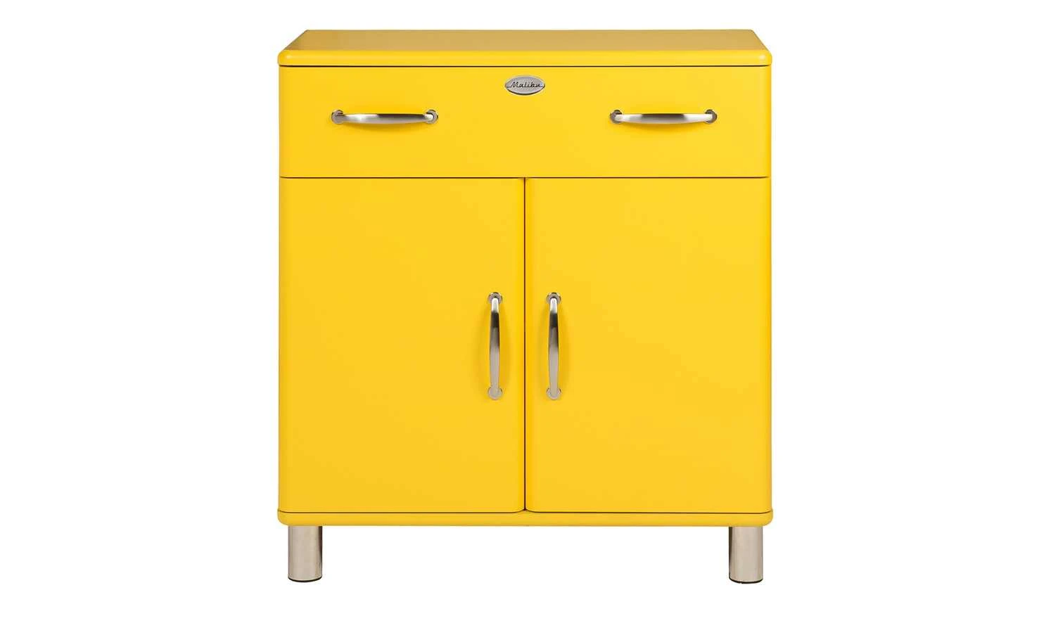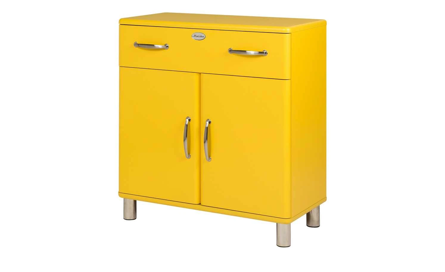 Modern und dennoch Retro ist die Kommode Malibu. Mit ihrem Design erinnert sie an die 50er-Jahre, bleibt dabei aber dennoch frisch und modern. Die Kommode ist lackiert und hat ein mattes Finish. Die Griffe und zylinderförmigen Füße sind aus Metall und setzen Akzente. Ebenso wie das kleine Malibu-Label mittig am Schubkasten. Malibu bietet Staumöglichkeiten in einem Schubkasten und hinter zwei Türen. Dahinter befinden sich zwei Fächer, die durch einen Boden getrennt werden.