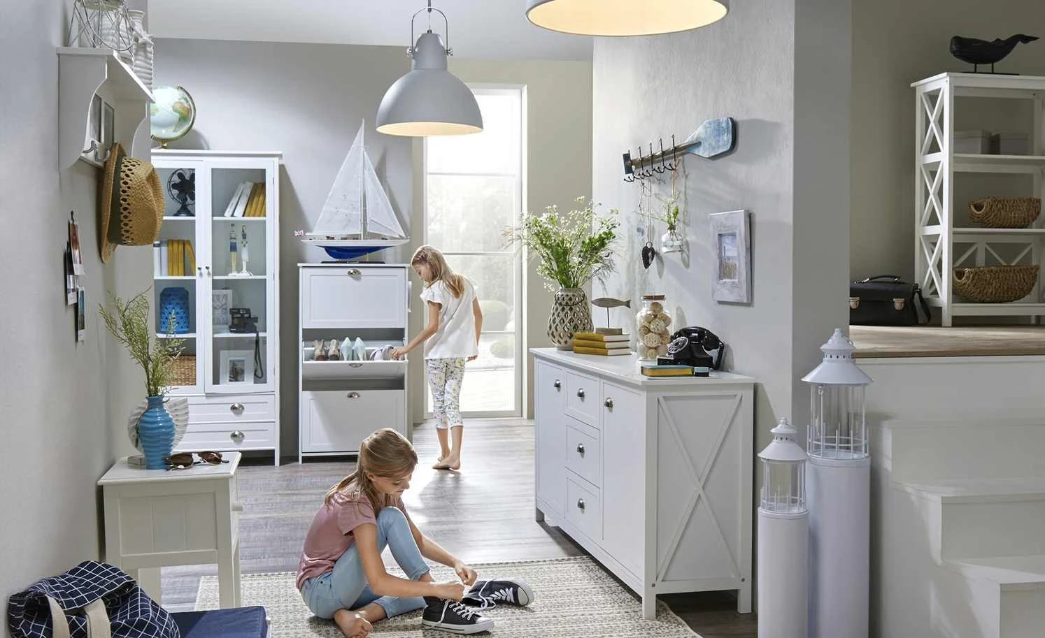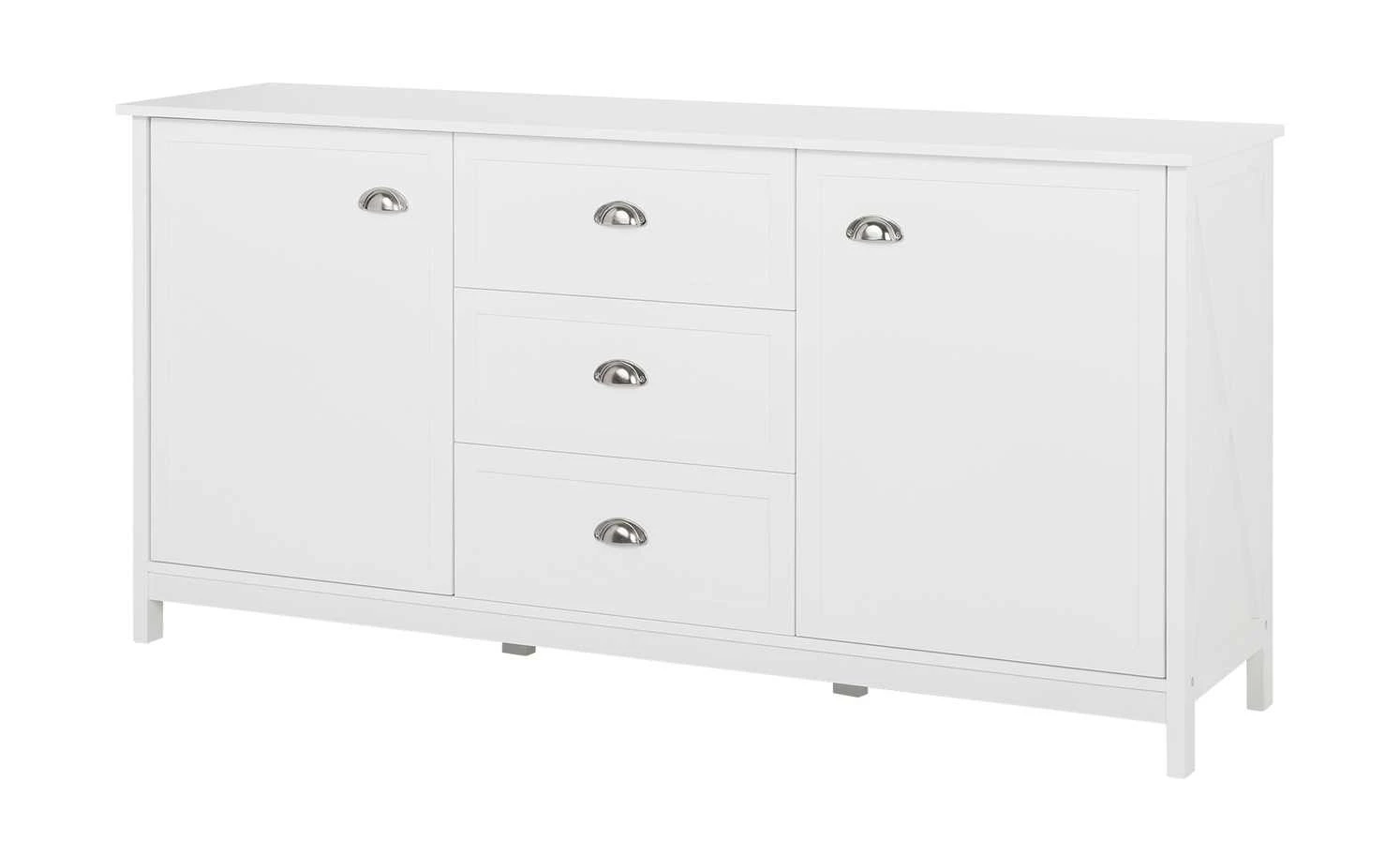 Mit ihrem Landhausstil ist die Kommode Mosi eine Bereicherung für Speisezimmer und Wohnraum. Mosi bietet Ihnen auf einer Gesamtbreite von zirka 160 Zentimetern ordentlich Stauraum hinter zwei Türen und drei Schubladen. Die Griffe im Apothekerstil sind aus glänzendem Metall. Korpus und Front sind lackiert – wahlweise in Weiß oder in Schwarzbraun.