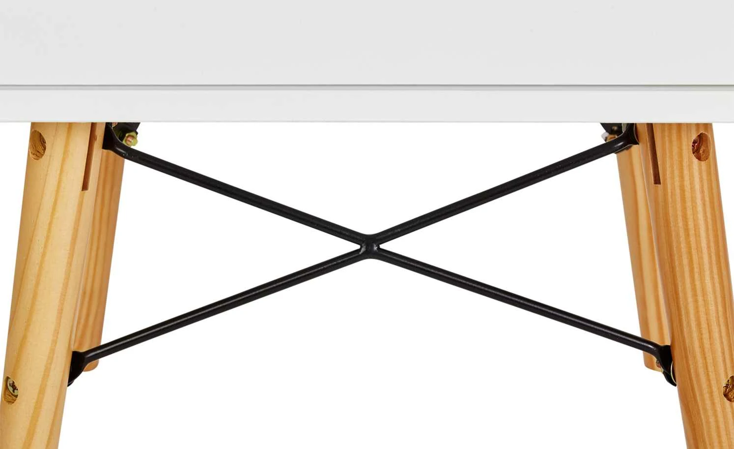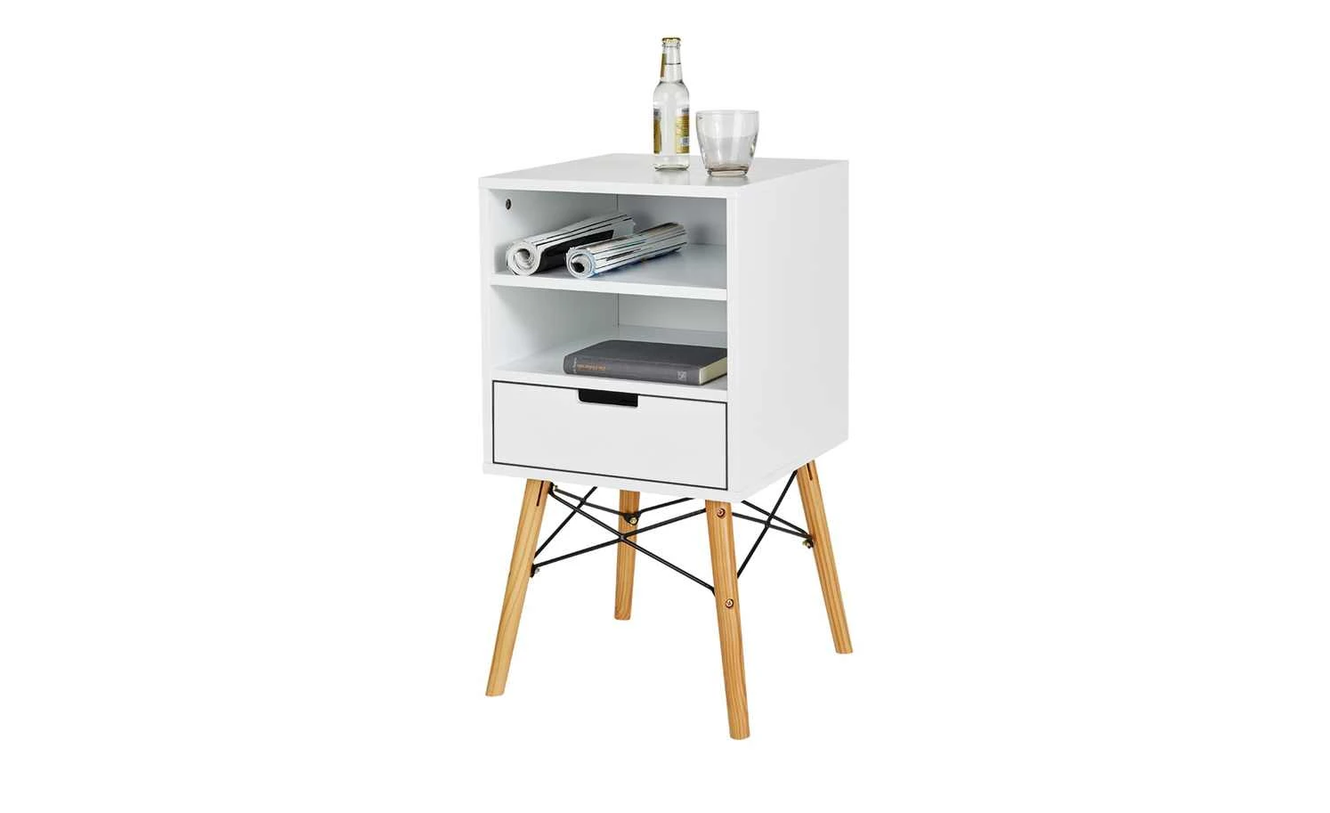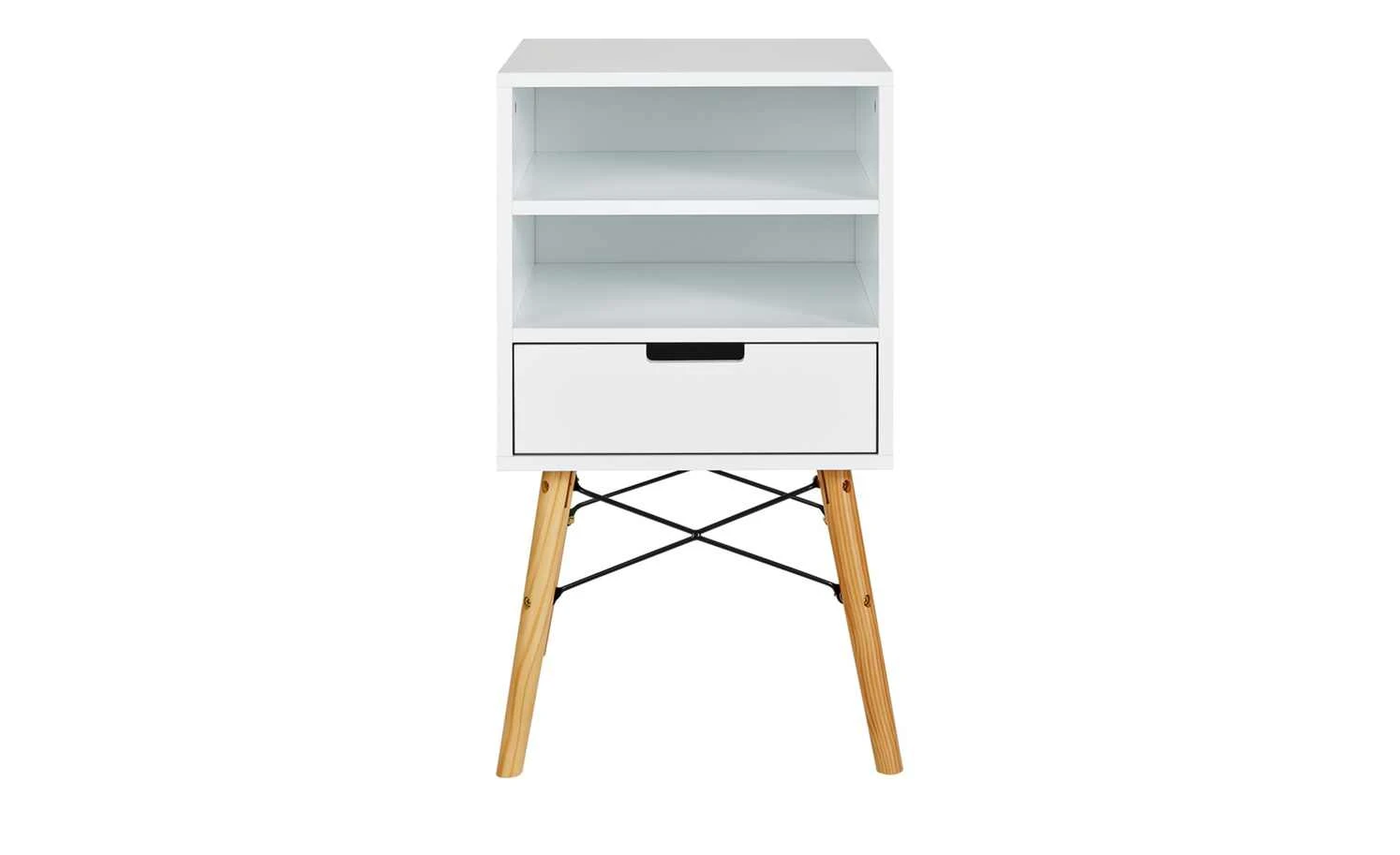Modernität und Retro-Stil vereinen sich in der Kommode New York 2. Die elegante Kommode ist in einem matt-weißen Ton gehalten und wirkt luftig und leicht. Die Beine aus massivem Pinienholz stellen einen geschmackvollen Kontrast zur weißen Farbe dar. Dadurch, dass die Beine nach unten schmaler werden und leicht abgespreizt sind, erinnern sie an den Stil der 50er und 60er Jahre. Metallverstrebungen zwischen den Beinen setzen nicht nur besondere Akzente, sondern sorgen auch für Stabilität. New York 2 ist mit einer Schublade ausgestattet, darüber befinden sich außerdem zwei offene Fächer.
