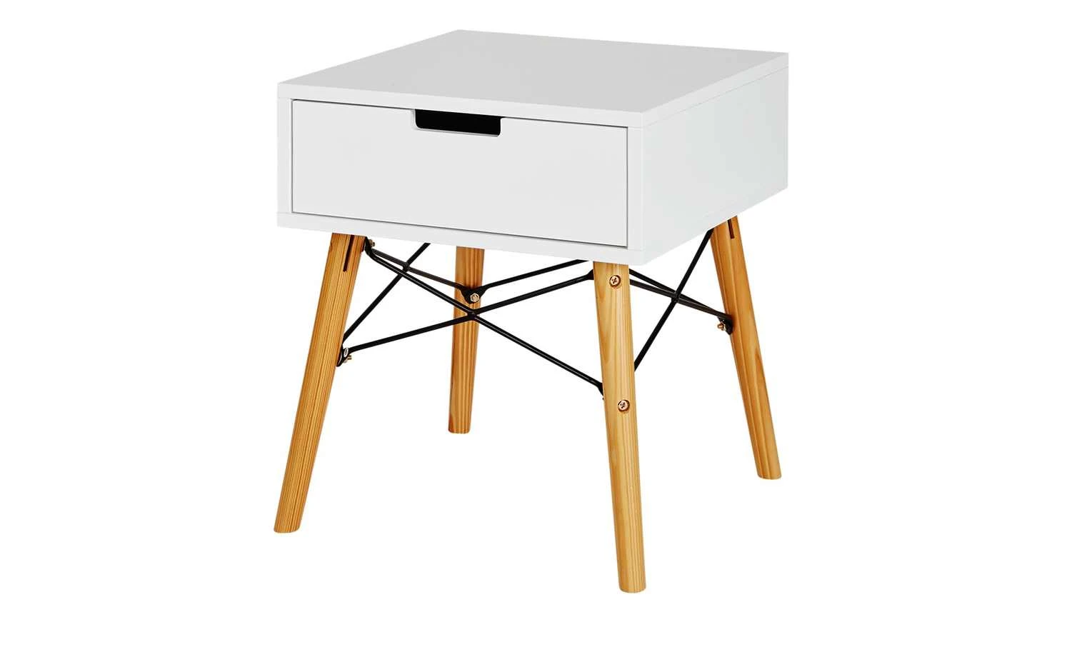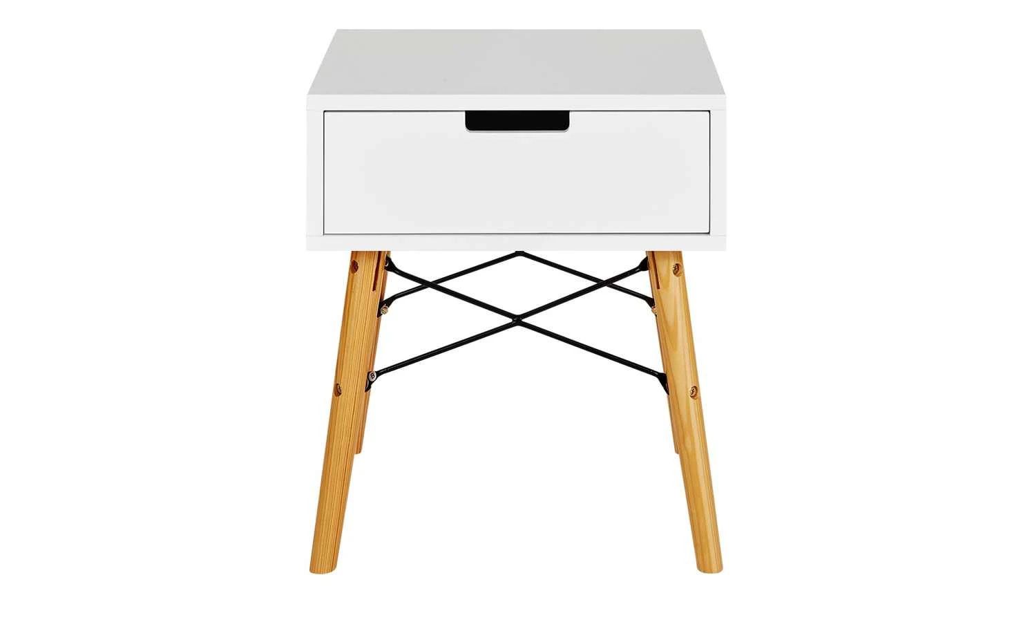 New York 4 eignet sich als Kommode oder Beistelltischchen gleichermaßen. Durch die langen Beine in Retro-Optik wirkt New York 4 luftig und leicht. Während Korpus und Front aus matt-weiß lackiert sind, wurden die schlanken Beine aus massivem Pinienholz hergestellt. Der natürliche Holzton stellt einen ansprechenden Kontrast zum Weiß dar. Ein außergewöhnlicher Blickfang sind die dunklen Metallverstrebungen zwischen den Holzbeinen. Die Kommode können Sie nicht nur als Stellmöglichkeit für Deko-Artikel oder Bilder verwenden, sie verfügt in einem Schubfach auch über Stauraum für allerlei Dinge.