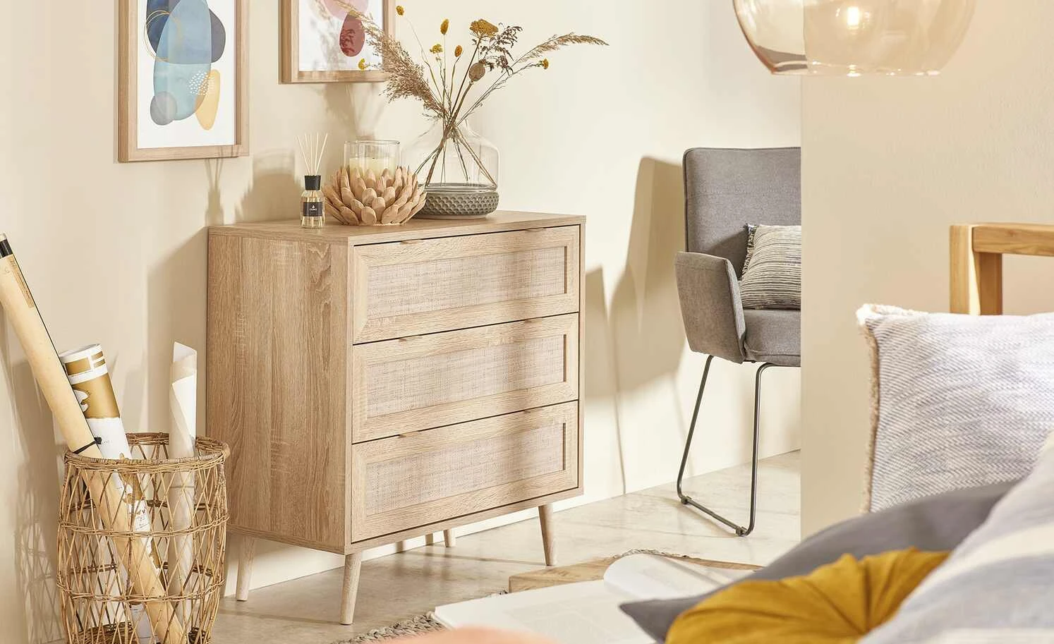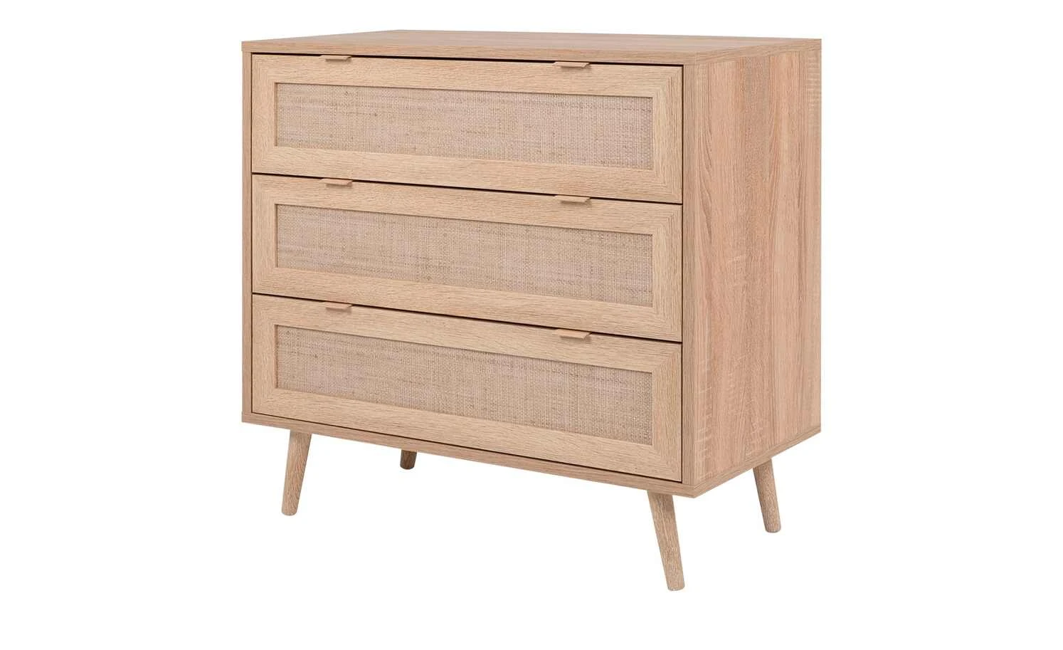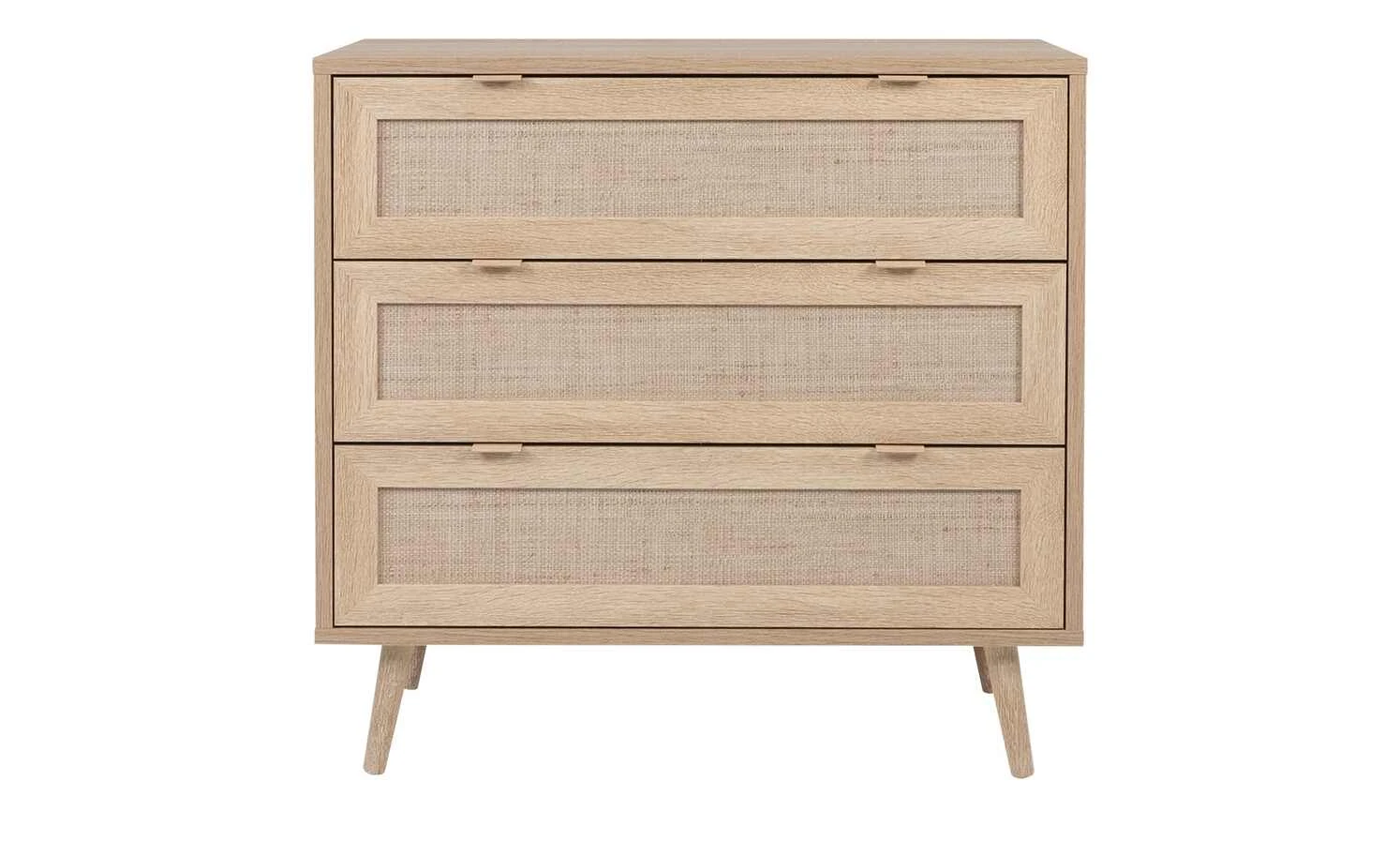 Die Kommode Rafia ist vielseitig einsetzbar und bietet großzügigen Stauraum für Ihre Sachen. Hinter den drei dekorativen Schubfachfronten in Bastgeflecht-Optik finden Kleidung, Spiele und andere Dinge problemlos Platz. Die helle Kommode wird von vier schräg zulaufenden Eichen-Massivholzfüßen getragen und macht in allen Räumen eine gute Figur. Die Serie Rafia erinnert an den beliebten Boho-Stil und fügt sich in nahezu alle Einrichtungskonzepte problemlos ein.