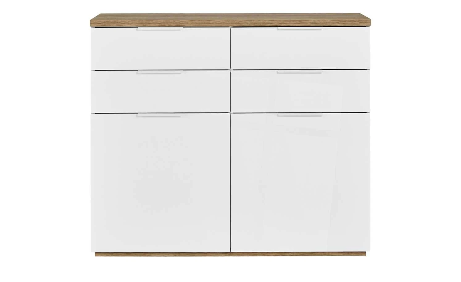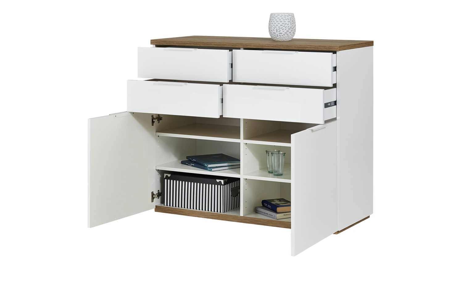 Urbanes Design und viel Stauraum machen die Kommode Siena zum Highlight eines jeden Raumes. Korpus und Front sind weiß und haben ein edles Hochglanzfinish. Abdeckplatte und Unterboden sind in Eiche Riviera (Nachbildung) gehalten und rahmen das Weiß so schön ein. Dank ihrer Beschichtung sind die Oberflächen kratzerunempfindlich. Siena verfügt über vier Schubladen und sechs Fächer hinter den beiden Türen.