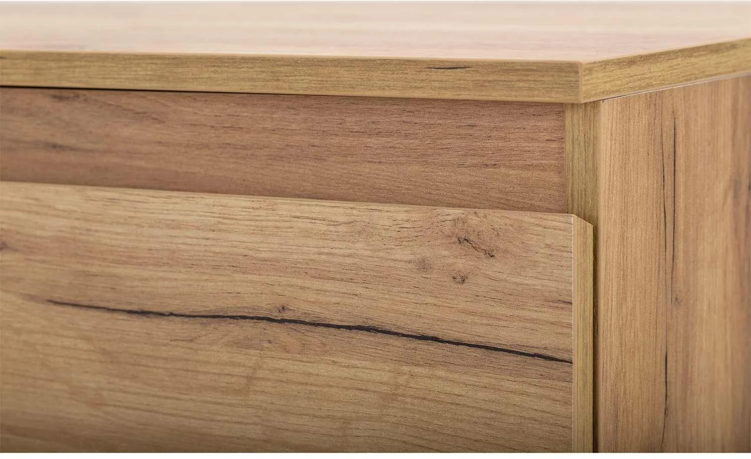 Ob im Wohnraum, Schlafzimmer oder Essbereich – die Kommode Tarent bietet praktischen Stauraum. Sie verfügt über drei geräumige Schubladen, die sich über die gesamte Breite der Kommode erstrecken. Tarent hat ein wohnlich-warmes Dekor in Honigeiche (Nachbildung), das sehr natürlich wirkt. Der obere Schubkasten setzt sich in Weiß ab. Die Kommode wirkt frisch und modern – und fügt sich gut in vorhandene Einrichtungen ein.