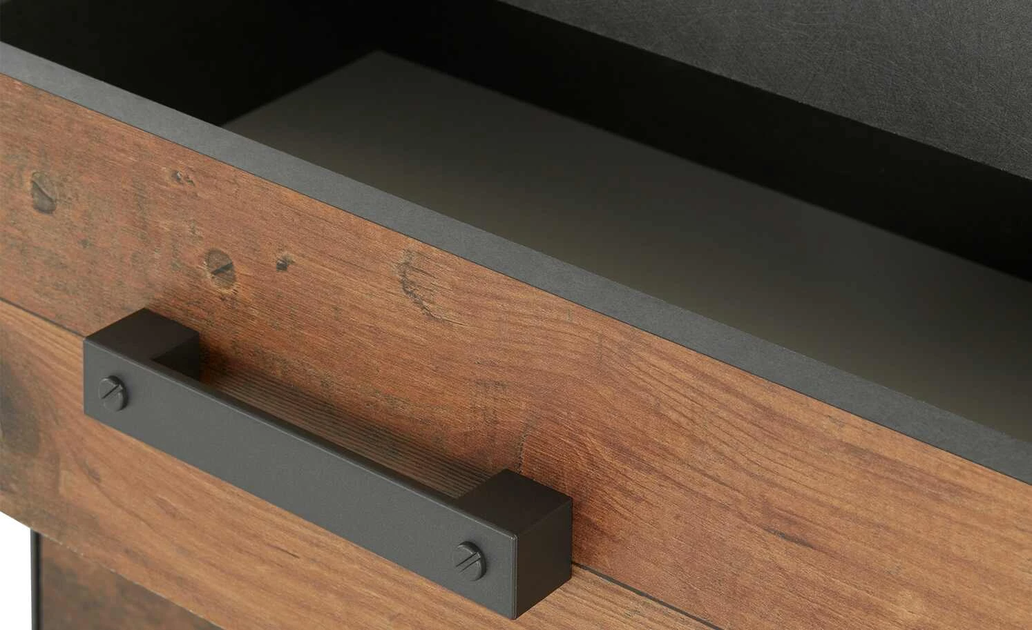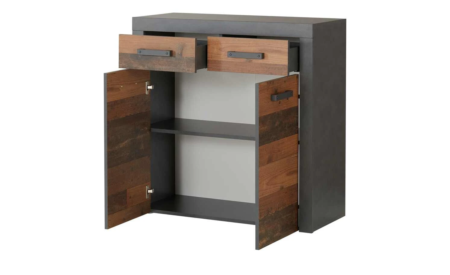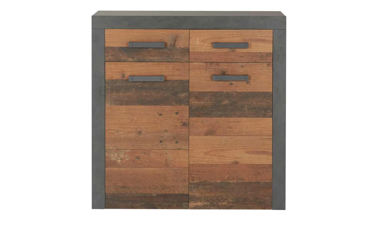 Diese Kommode bietet nicht nur praktischen Stauraum, sondern überzeugt auch mit ihrer attraktiven Industrial-Note. Die anthrazitfarbenen Oberflächen sind mit gewollten Used-Effekten versehen und passen perfekt zu den Fronten in Altholz-Optik. Auch die Metallgriffe sind anthrazitfarben und harmonieren mit dem Gesamtdesign. In den beiden Schubfächern und in den beiden Fächern können Sie allerlei Dinge unterbringen. Die Kommode kann ganz nach Ihrem Bedarf genutzt werden und in Wohn-, Schlaf-, oder Arbeitsräumen stehen.