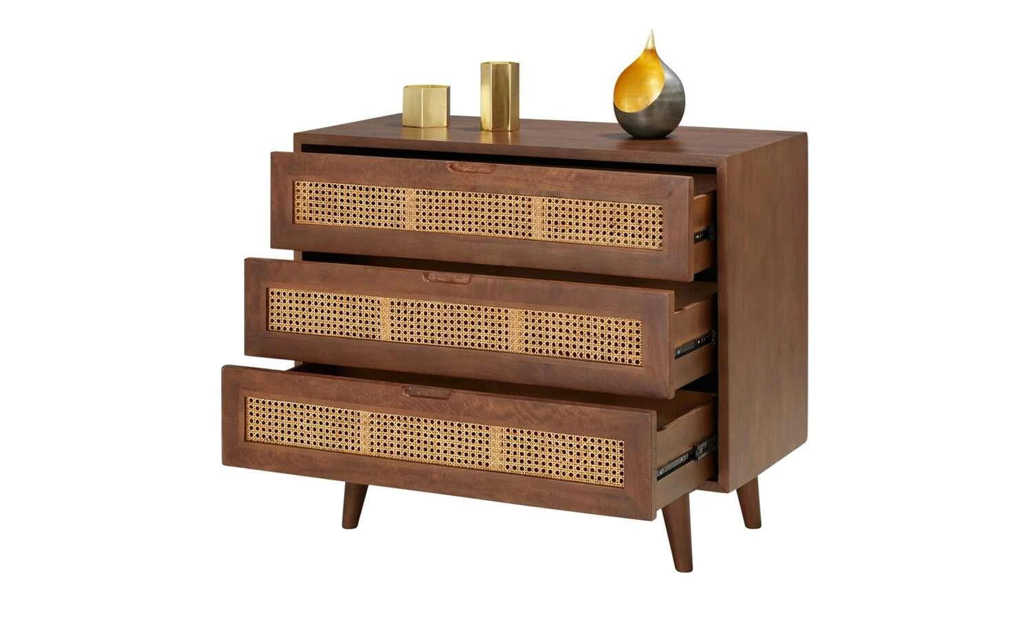 Die Serie Tweed Me entführt Sie in längst vergangene Zeiten und bringt Wiener Eleganz in Ihre vier Wände. So auch die Kommode aus dunklem Mango-Massivholz, welches für den Korpus und die Füße genutzt wurde. Farblicher Kontrast zu dem schön gemaserten Holz sind die Fronten der drei Schubfächer. Diese sind aus natürlichem Rattan zu einem edlen Achteck-Muster geflochten, welches auch als Wiener Geflecht bekannt ist. Die vier konischen, schräg zulaufenden Massivholzfüße runden das Gesamterscheinungsbild gekonnt ab.