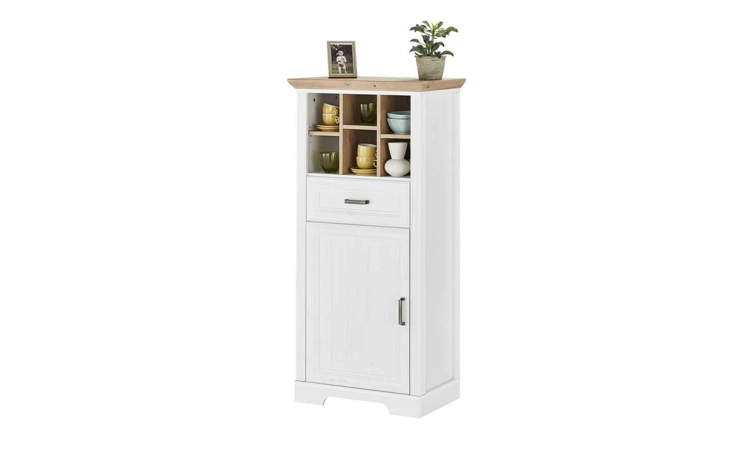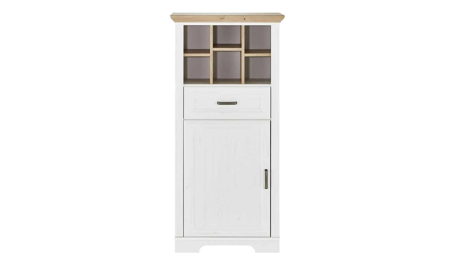 Highlight der Kommode Varese ist das integrierte Weinregal. Es bietet Platz für sechs Flaschen. Alternativ können Sie die offenen Fächer natürlich auch für andere Dinge nutzen. Darüber hinaus ist Varese mit einer Schublade und einer Tür ausgestattet, hinter der sich zwei Fächer befinden. Den Einlegeboden können Sie in der Höhe verstellen. Die Kommode ist im Landhausstil verziert und hat ein sehr freundliches, helles Dekor in Pinie hell (Nachbildung). Abdeckplatte und Regaleinsatz setzen sich in Asteiche (Nachbildung) ab.