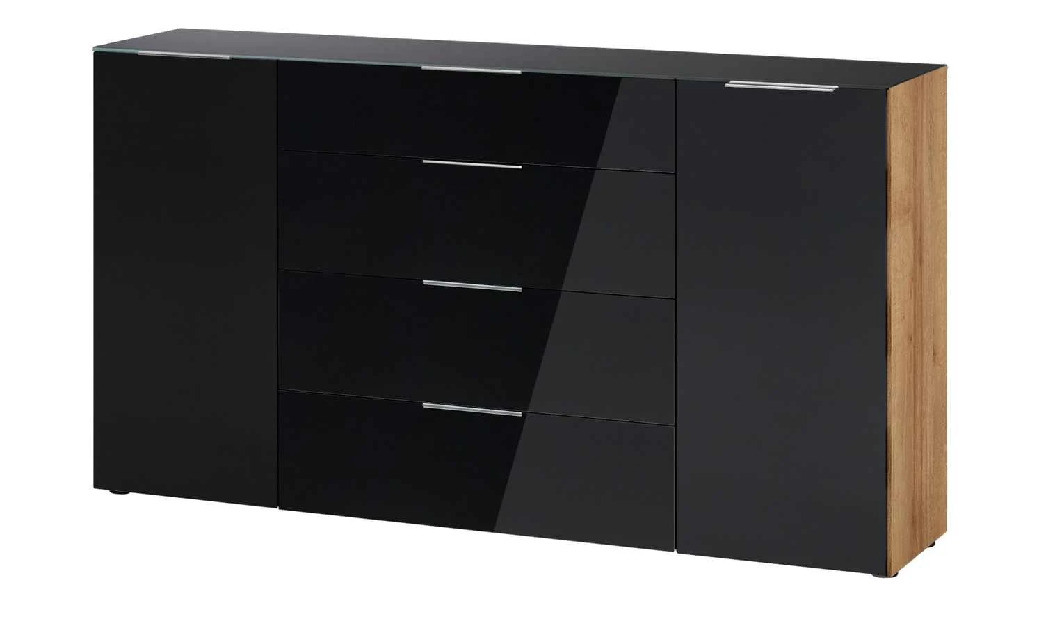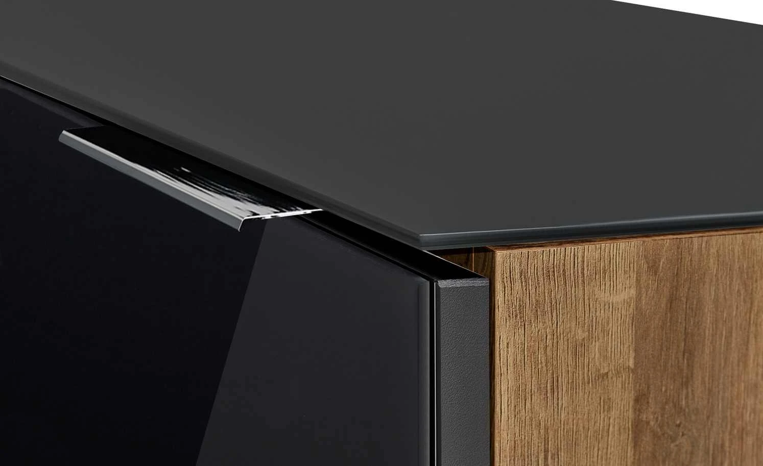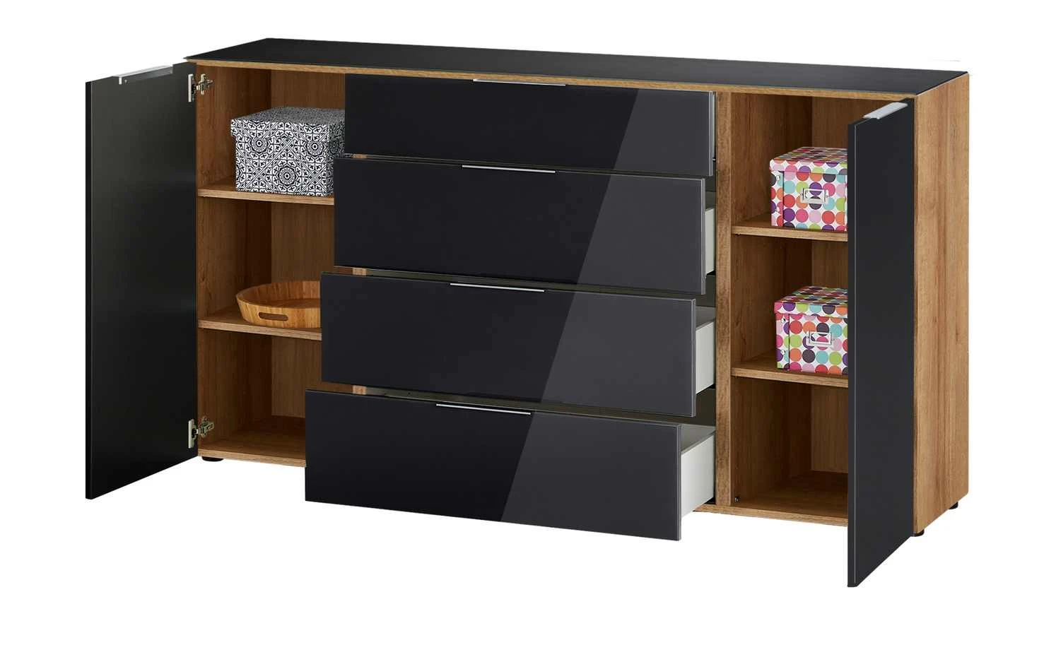 Mit ihrem modernen Look und praktischen Nutzen ist die Kommode Vitreo ein Highlight für jeden Raum. Die geradlinige Linienführung wird mit einem coolen Anthrazit kombiniert. Die Front hat eine Oberfläche aus ESG-Sicherheitsglas. Es ist besonders hart und widerstandsfähig – und gibt der Front ein glänzendes Finish. Zusätzliche Akzente werden durch die verchromten Griffleisten gesetzt. Der Korpus der Kommode hat eine natürliche Holzoptik. Er ist melaminbeschichtet und somit kratzerunempfindlich und leicht zu pflegen. Vitreo ist mit vier großen Schubladen ausgestattet, die übereinander angeordnet sind. Links und rechts davon befindet sich jeweils eine Tür mit drei Fächern dahinter. Alle vier Schubkästen und die beiden Türen haben einen integrierten Dämpfer für leises Schließen.
