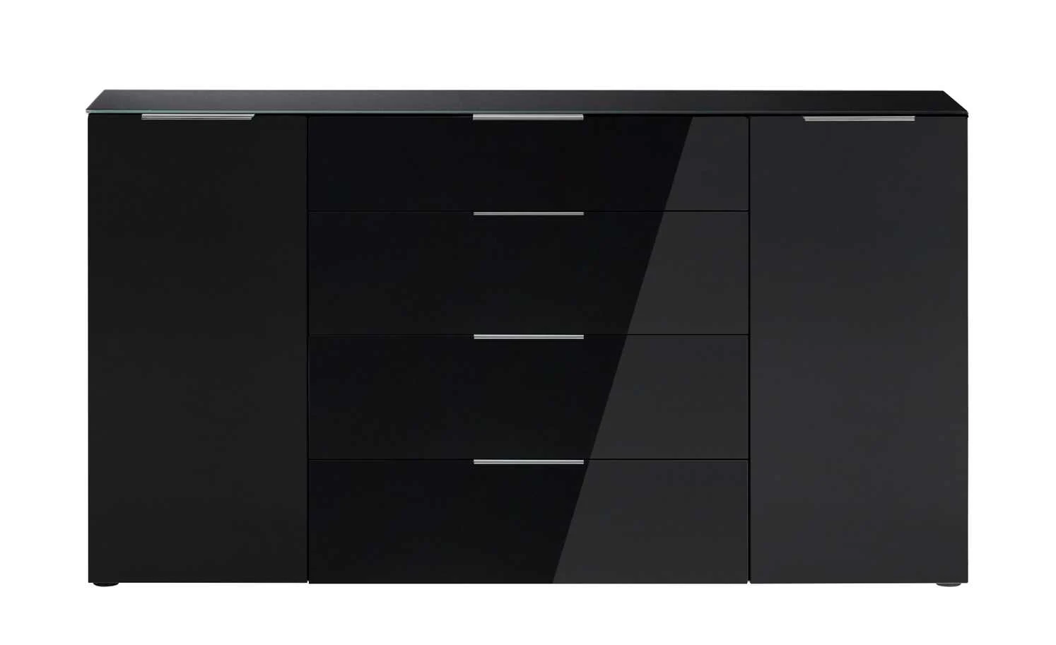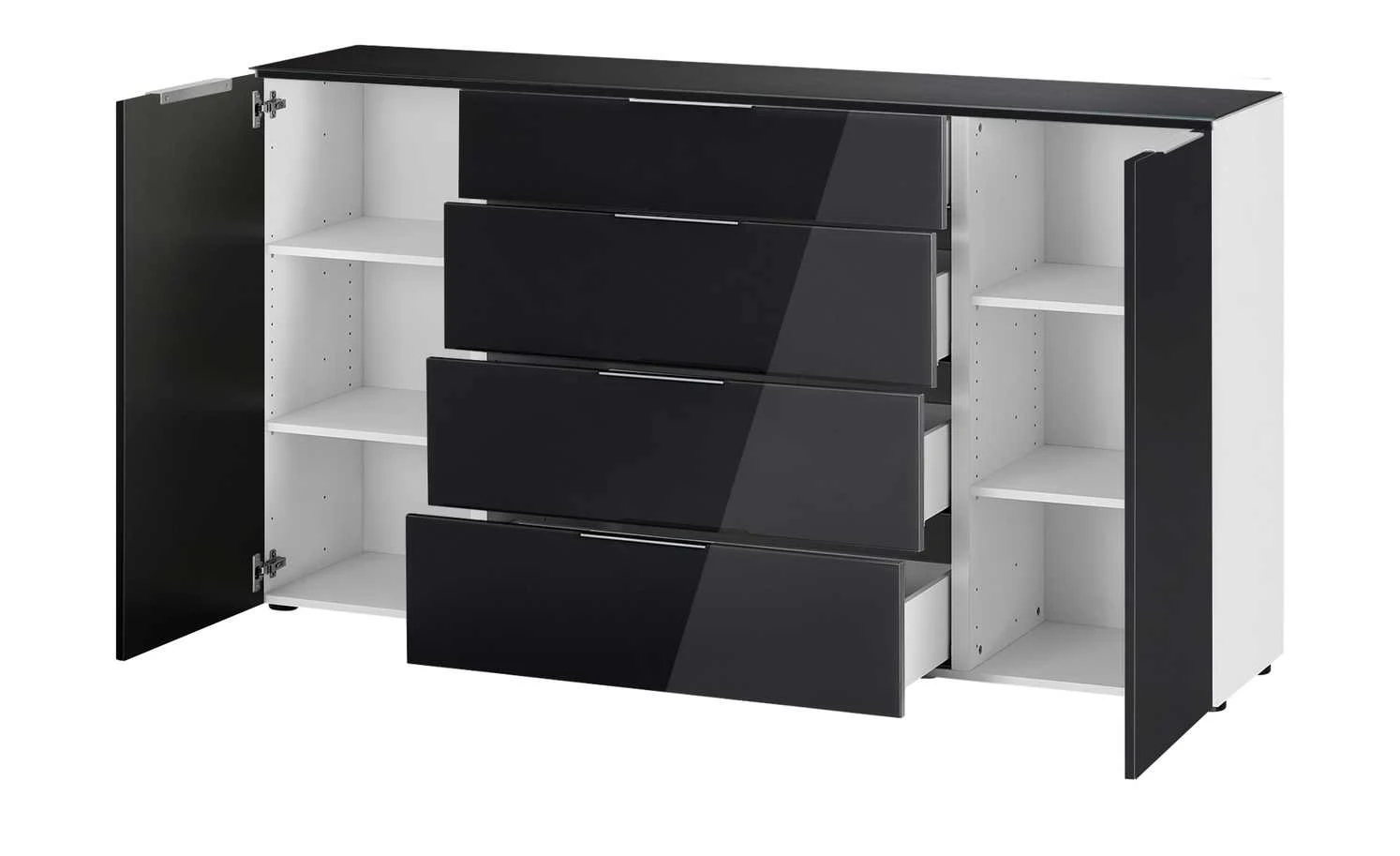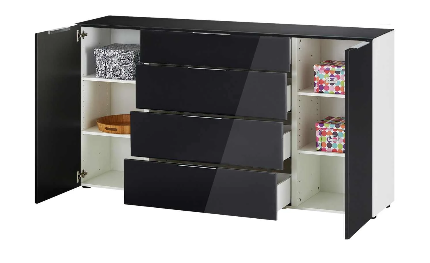 Mit ihrem modernen Look und praktischen Nutzen ist die Kommode Vitreo ein Highlight für jeden Raum. Die geradlinige Linienführung wird mit einem coolen Anthrazit kombiniert. Die Front hat eine Oberfläche aus ESG-Sicherheitsglas. Es ist besonders hart und widerstandsfähig – und gibt der Front ein glänzendes Finish. Zusätzliche Akzente werden durch die verchromten Griffleisten gesetzt. Der Korpus der Kommode setzt sich in Weiß ab. Er ist melaminbeschichtet und somit kratzerunempfindlich und leicht zu pflegen. Vitreo ist mit vier großen Schubladen ausgestattet, die übereinander angeordnet sind. Links und rechts davon befindet sich jeweils eine Tür mit drei Fächern dahinter. Alle vier Schubkästen und die beiden Türen haben einen integrierten Dämpfer für leises Schließen.