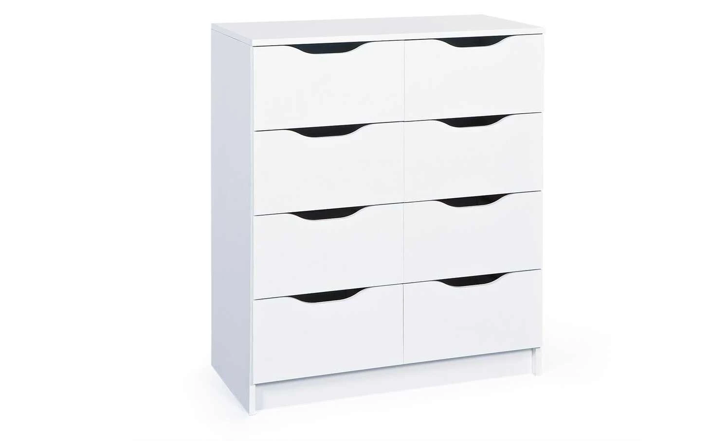 Diese praktische Kommode bietet großzügigen Stauraum in acht Schubfächern. Durch die pflegeleichten, weißen Oberflächen lässt sich die Kommode in zahlreiche Einrichtungskonzepte und Räume integrieren.