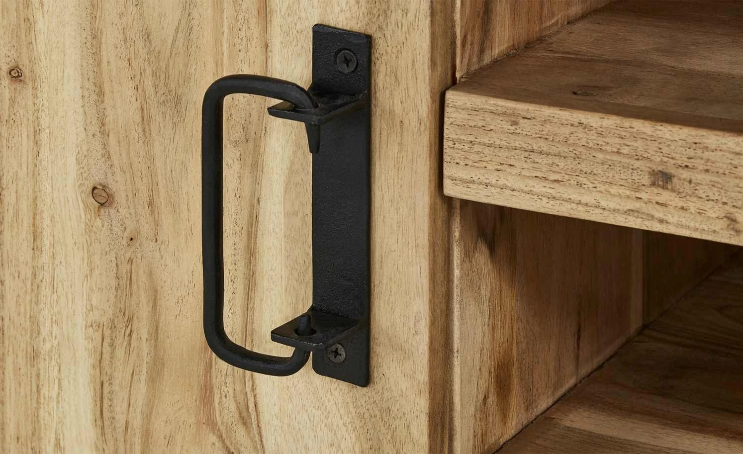 Massives Akazienholz und mattschwarze Metallkufenfüße erzeugen beim Lowboard Queens den beliebten Industrial-Look. Das einzigartig gemaserte Holz wurde gebeizt und lackiert und setzt einen schönen Kontrast zu den schwarzen Kufenfüßen. In den zwei offenen Fächer auf der rechten Seite können Sie Zeitschriften, Bücher oder Zubehör ablegen. Hinter der blickdichten Tür auf der linken Seite finden Sie zusätzlichen Stauraum. Das Lowboard Queens lässt sich nicht nur mit der gleichnamigen Serie kombinieren, sondern passt auch in weitere zahlreiche Einrichtungsstile.