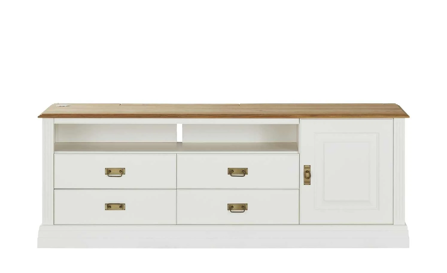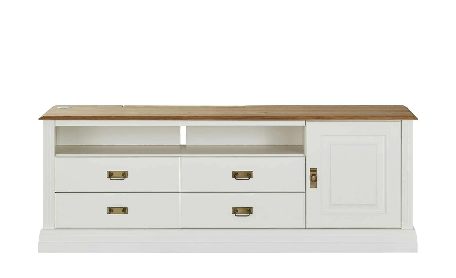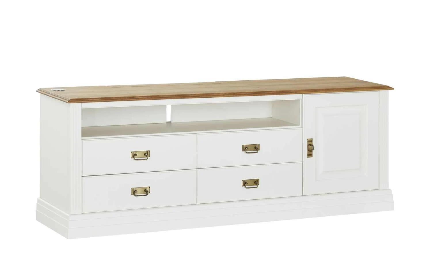 Das Landhausdesign strahlt Gemütlichkeit und Geborgenheit aus. Auch das TV-Lowboard Lina von der Marke maison bleue ist im Landhausstil designt. Passend dazu: der freundliche reinweiße Farbton. Die Abdeckplatte setzt sich in Wildeiche Natur ab. Ein schöner, natürlicher Kontrast zur hellen Farbe. Lina ist komplett aus Massivholz gefertigt. Dadurch ist das Lowboard besonders stabil und langlebig. Auch die Verarbeitung und fein lackierten bzw. geölten Oberflächen haben eine herausragende Qualität. Neben Platz für Ihren Fernseher und einem großen Gerätefach, bietet Lina Stauraum hinter einer Tür und in zwei Schubladen. Das Kabelmanagement sorgt dafür, dass störender Kabelsalat verhindert wird.