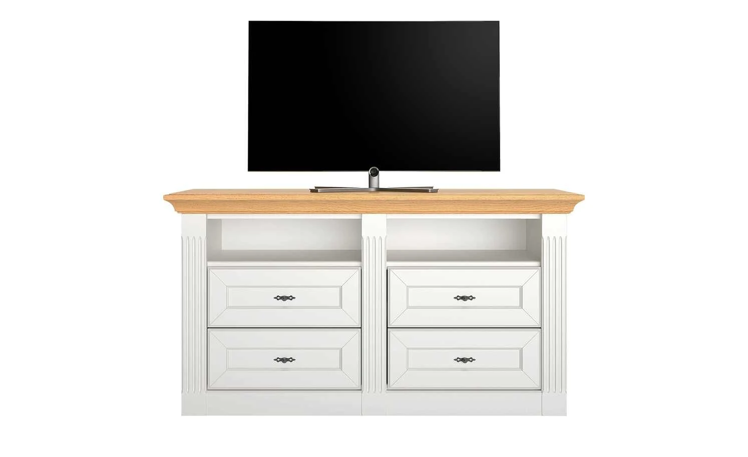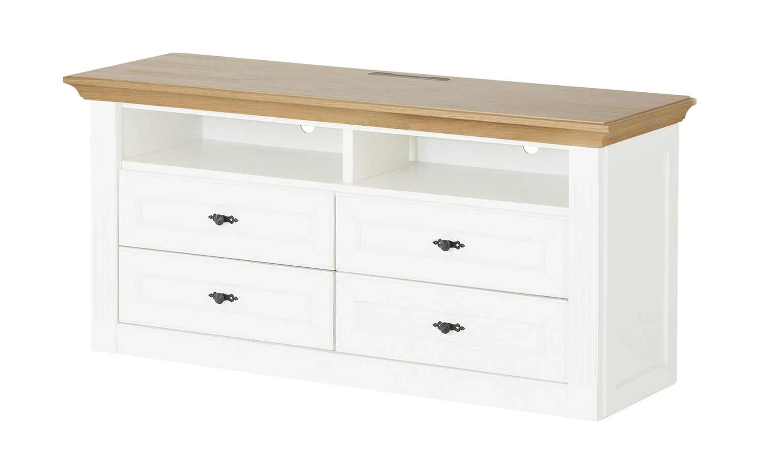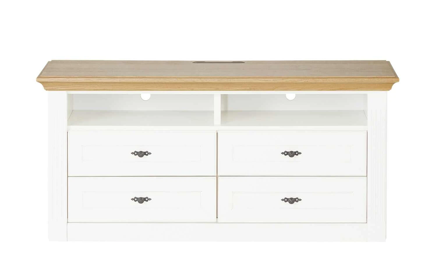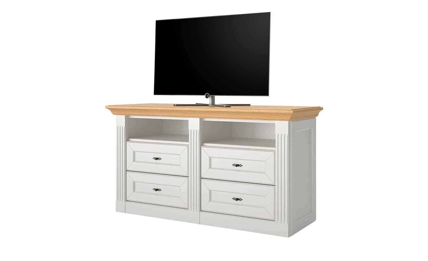 - Mehr zum Material: Absetzung aus Asteiche furniert , Korpus und Front aus Holzwerkstoff Weiß lackiert
