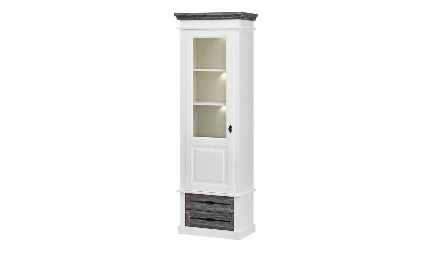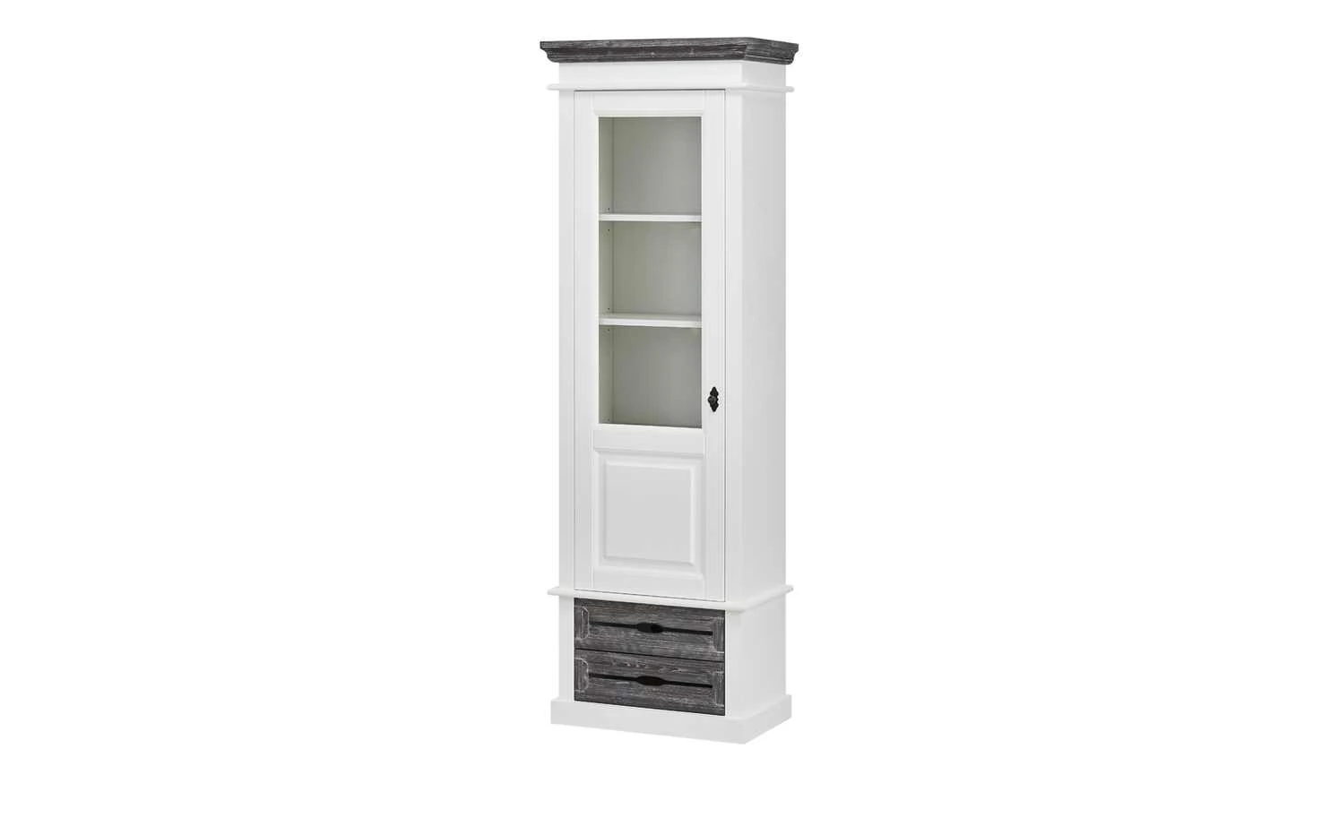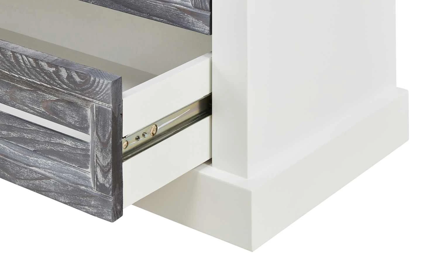 - Mehr zum Material: abgesetzte Fronten, Deckplatte und Kranz sind aus Massivholz (Astfichte), Antikgrau gebürstet und gekälkt