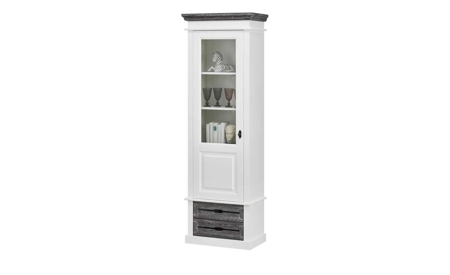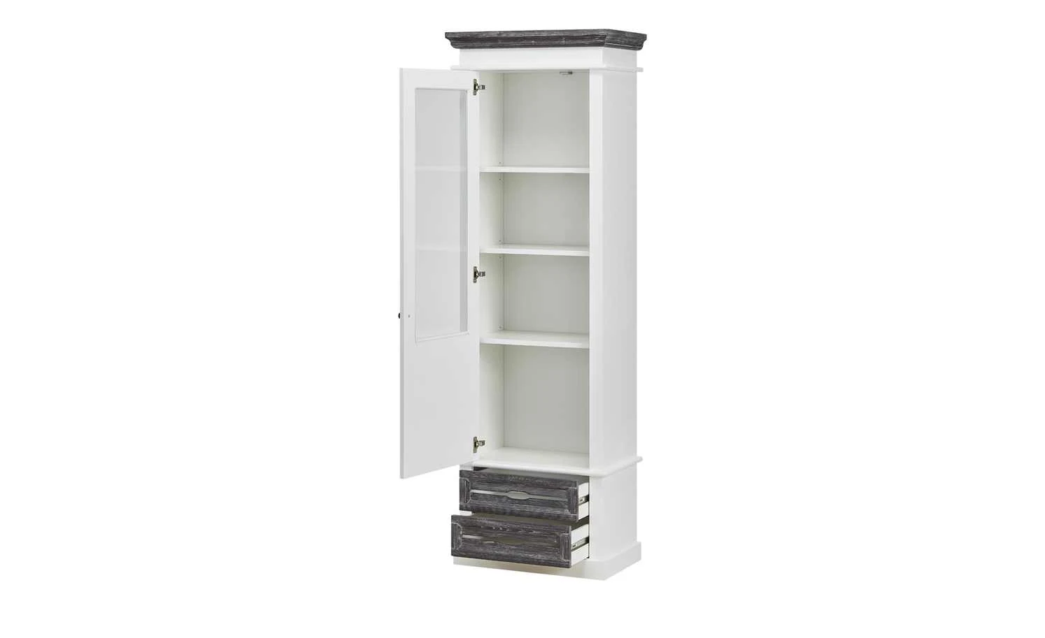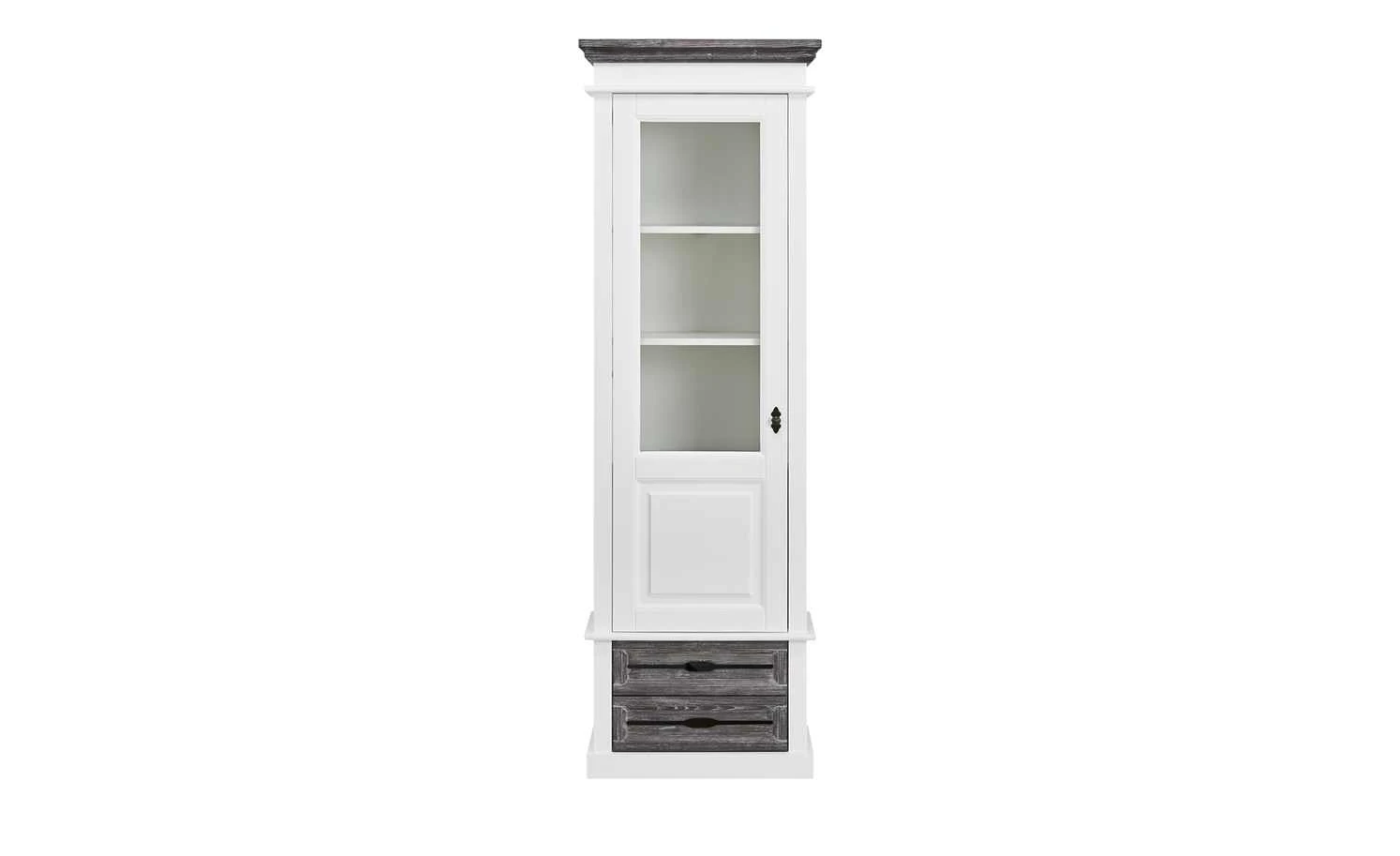 - Mehr zum Material: abgesetzte Fronten, Deckplatte und Kranz sind aus Massivholz (Astfichte), Antikgrau gebürstet und gekälkt