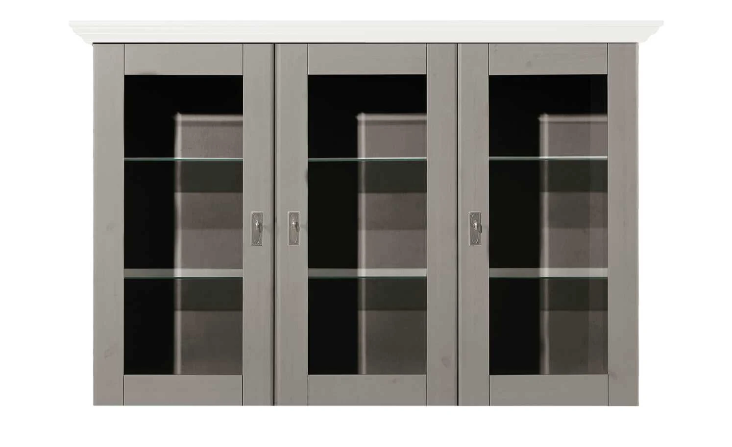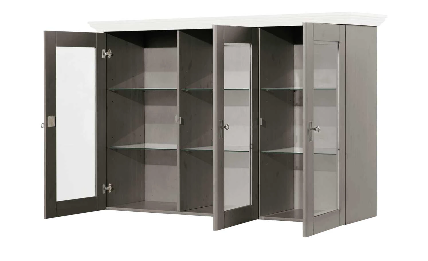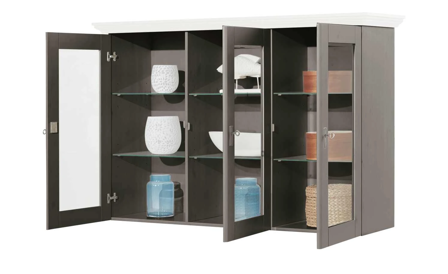 Vitrinen sind gleich doppelt praktisch. Sie bieten Stauraum – und zeitgleich können Sie darin Ihr Geschirr oder Porzellan in Szene setzen. Der Vitrinenaufsatz Florian von maison bleue ist eine Ergänzung für das gleichnamige Sideboard. Er wird einfach auf das Sideboard gesetzt. Der Aufsatz im Landhausstil verfügt über drei Türen mit Glaseinsatz. Für einen freien Blick in die Fächer dahinter. Innen können Sie gleich neun Vitrinenfächer nutzen. Florian besteht aus massiver Kiefer und ist weiß gebeizt und lackiert. Der Kranz setzt sich farblich ab.