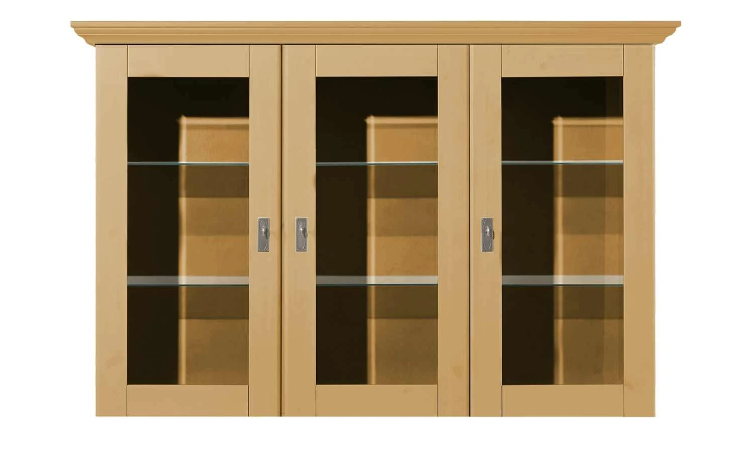 Vitrinen sind gleich doppelt praktisch. Sie bieten Stauraum – und zeitgleich können Sie darin Ihr Geschirr oder Porzellan in Szene setzen. Der Vitrinenaufsatz Florian von maison bleue ist eine Ergänzung für das gleichnamige Sideboard. Er wird einfach auf das Sideboard gesetzt. Der Aufsatz im Landhausstil verfügt über drei Türen mit Glaseinsatz. Für einen freien Blick in die Fächer dahinter. Innen können Sie gleich neun Vitrinenfächer nutzen. Florian besteht aus massiver Kiefer und ist weiß gebeizt und lackiert. Der Kranz setzt sich farblich ab.