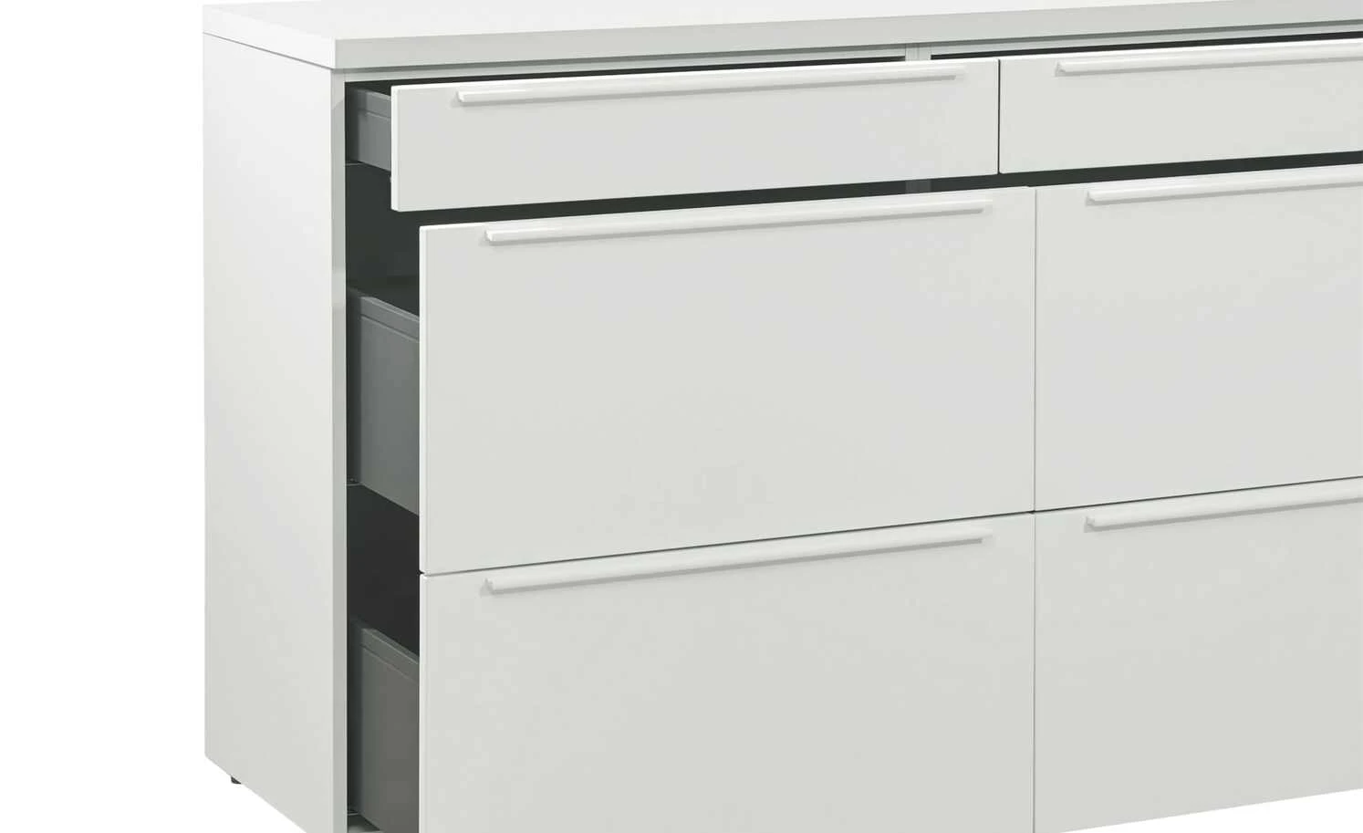- Mehr zu Ausstattung / Funktion: 1,7 cm hohe schwarze Kunststoff-Stellfüße, die durch Drehen Unebenheiten ausgleichen und einen schwebenden Charakter erzeugen, supermatte, samtige Oberflächen mit Anti-Fingerprint-Ausrüstung, Schubladen auf Unterflurkugelführung mit gedämpftem Selbsteinzug als Teilauszug