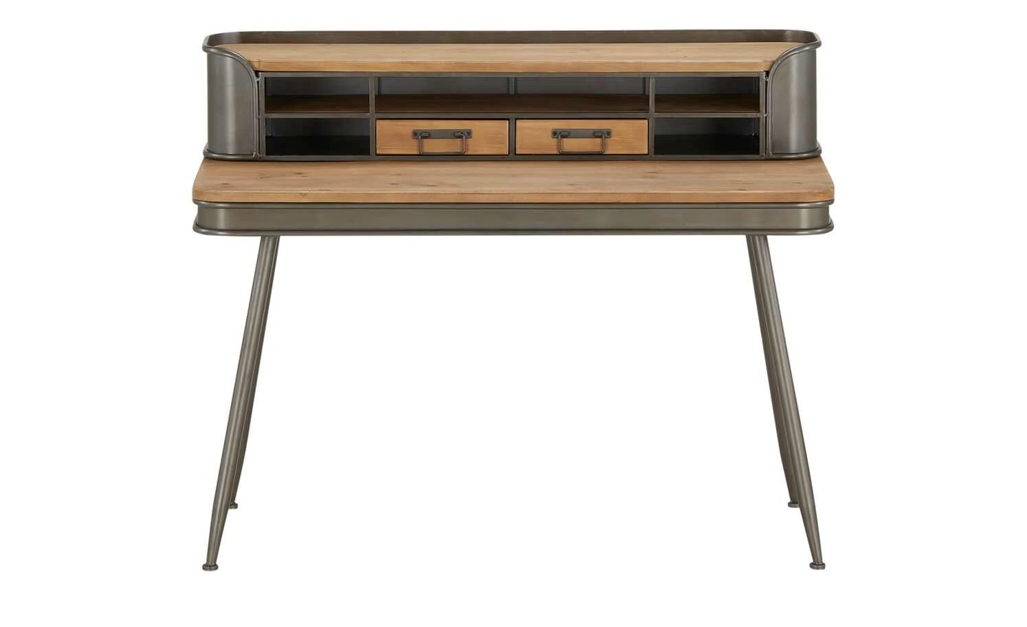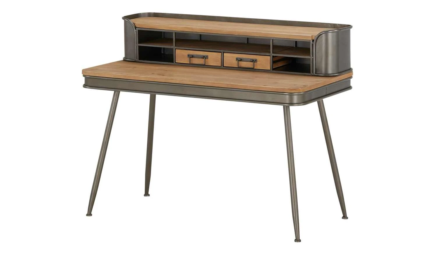 Für Liebhaber des Industrial-Styles ist dieser Sekretär ein Muss. Der insgesamt 95 Zentimeter hohe Tisch überzeugt mit einem attraktiven Mix aus Metall und Massivholz. Verstauen Sie Kleinkram in den beiden Schubkästen und nutzen sie die drei offenen Fächer für Bürozubehör. Das obere Fach ist durch zwei Metallstreben optisch unterteilt und wirkt daher wie drei Fächer. Dadurch entsteht eine symmetrische Optik. Auf der knapp 120 Zentimeter langen Abdeckplatte können Sie ebenfalls Bücher und andere Dinge platzieren.