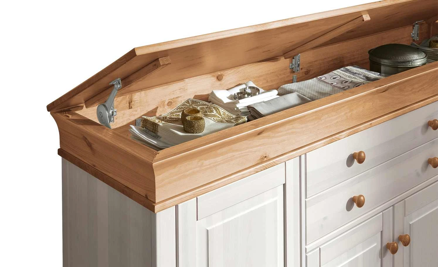 Das Sideboard Bornholm gibt Ihrem Wohn- oder Esszimmer ein nostalgisches Landhaus-Ambiente. Die Kommode aus massiver, weiß gewachster Kiefer wird durch antikfarben lackierte Absetzungen akzentuiert. Besonders schön anzusehen sind die sogenannten Kassettenfüllungen an den Türen, also die eingefrästen Muster. Das Sideboard bietet hinter zwei Schubkästen und vier Holztüren genug Platz, um Ihr Geschirr oder Ihre Tischwäsche zu verwahren. Ein ganz besonderes Highlight ist die aufklappbare Oberplatte, unter der sich ein weiterer Stauraum versteckt.
