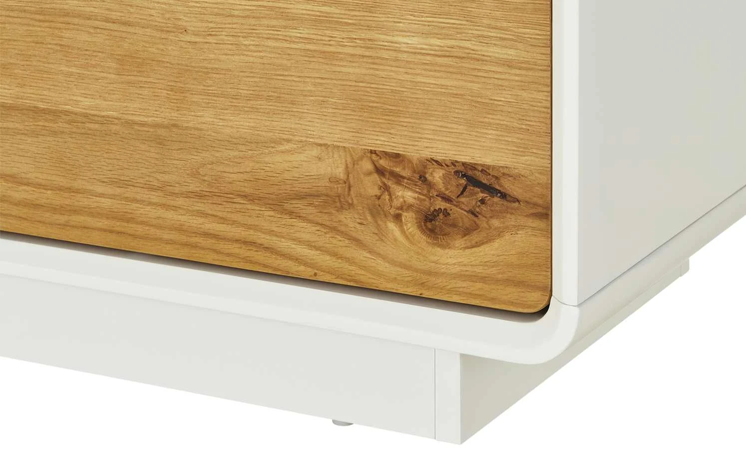Das Sideboard Bruneck setzt auf Kontraste. Es hat eine natürlich-charmante Front, die mit Asteiche furniert ist. Das Holz verfügt über eine stark ausgeprägte Maserung mit diversen Farbnuancen und Asteinschlüssen. Damit das Naturmaterial besonders schön zur Geltung kommt, wurde auf Griffe verzichtet. Türen und Schubladen sind mit einer Push-to-Open-Funktion ausgestattet, bei der Sie auf die Front der beiden Türen und drei Schübe drücken, um sie zu öffnen. Für den Korpus ist ein schlichtes Weiß mit mattem Finish verwendet worden.