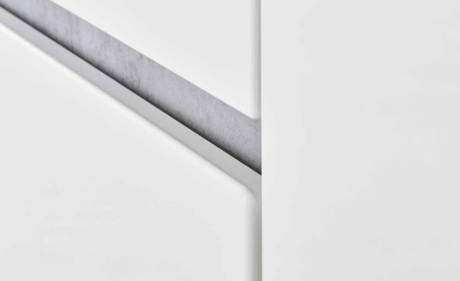 Mit dem Sideboard Puro schaffen Sie Ordnung. Es bietet gut aufgeteilten Stauraum hinter den vier Türen und in den beiden Schubladen. Die sechs Einlegeböden können Sie nach Bedarf in der Höhe verstellen. Puro hat einen matten Korpus in Alpinweiß. Die Front ist hochglänzend weiß. Ein extravaganter Eyecatcher ist die Absetzung in Beton (Nachbildung). Mit der mitgelieferten LED-Beleuchtung für die Front können Sie Puro noch besser in Szene setzen.