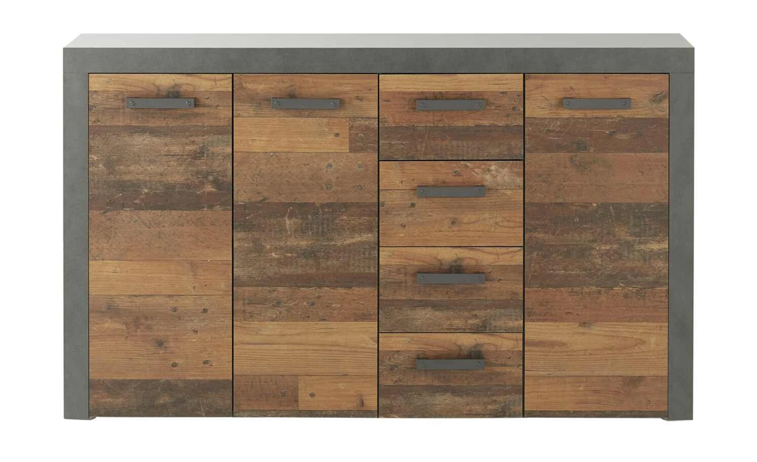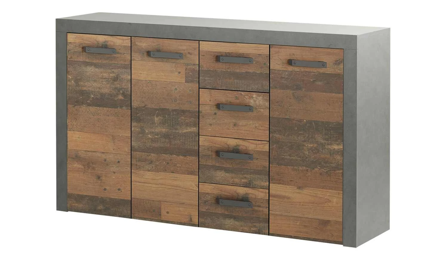 Das Sideboard Tavola bietet nicht nur praktischen Stauraum, sondern überzeugt auch mit seiner attraktiven Industrial-Note. Die anthrazitfarbenen Oberflächen sind mit leichten Used-Effekten versehen und passen perfekt zu den Fronten in Altholz-Optik. Auch die Metallgriffe sind anthrazitfarben und harmonieren mit dem Gesamtdesign. Der clever unterteilte Stauraum passt zu zahlreichen Raumkonzepten. Dadurch kann das Sideboard im Arbeits-, Wohn-, oder sogar auch Schlafzimmer stehen und für Bettwäsche, Dokumente und Anderes verwendet werden.