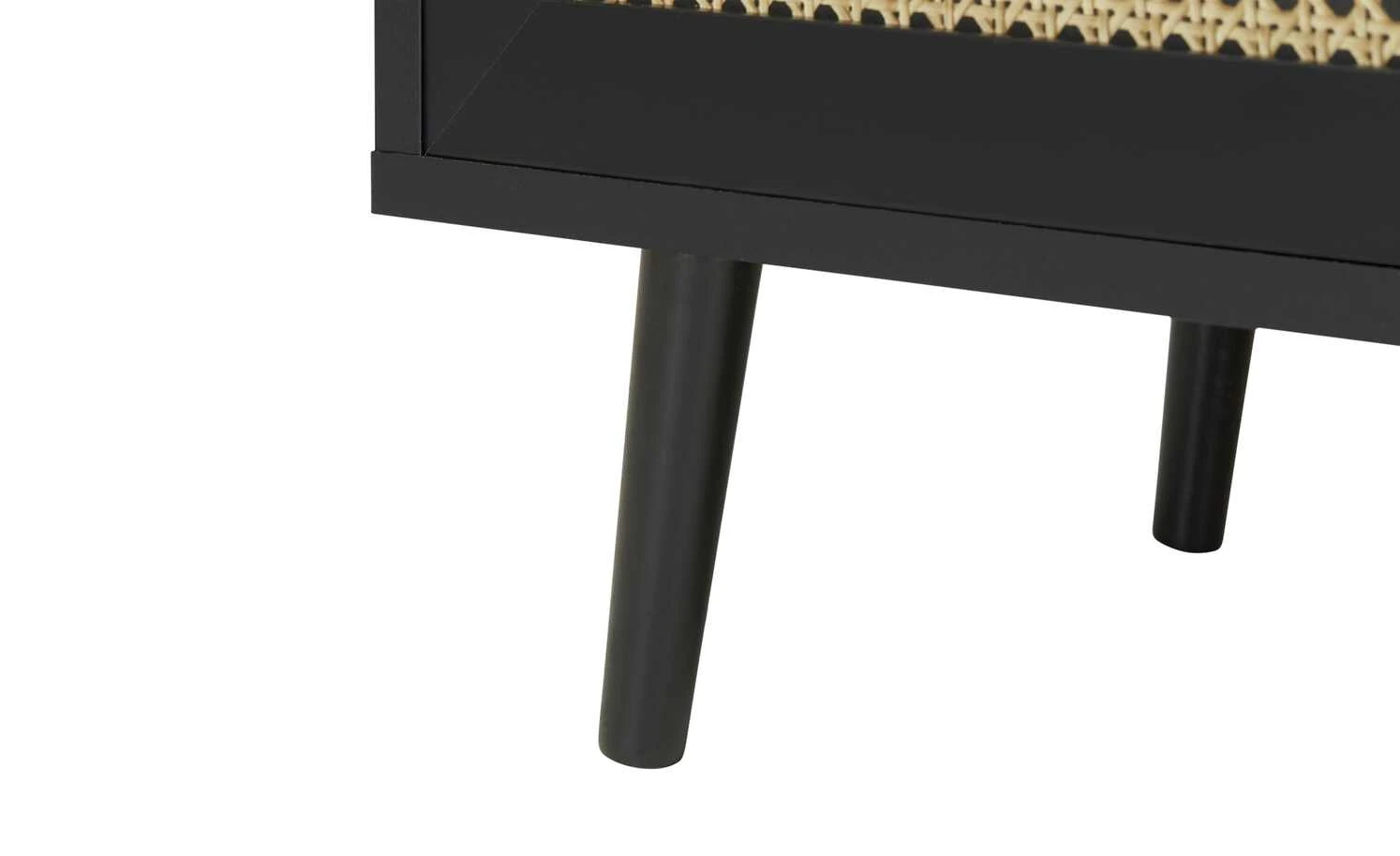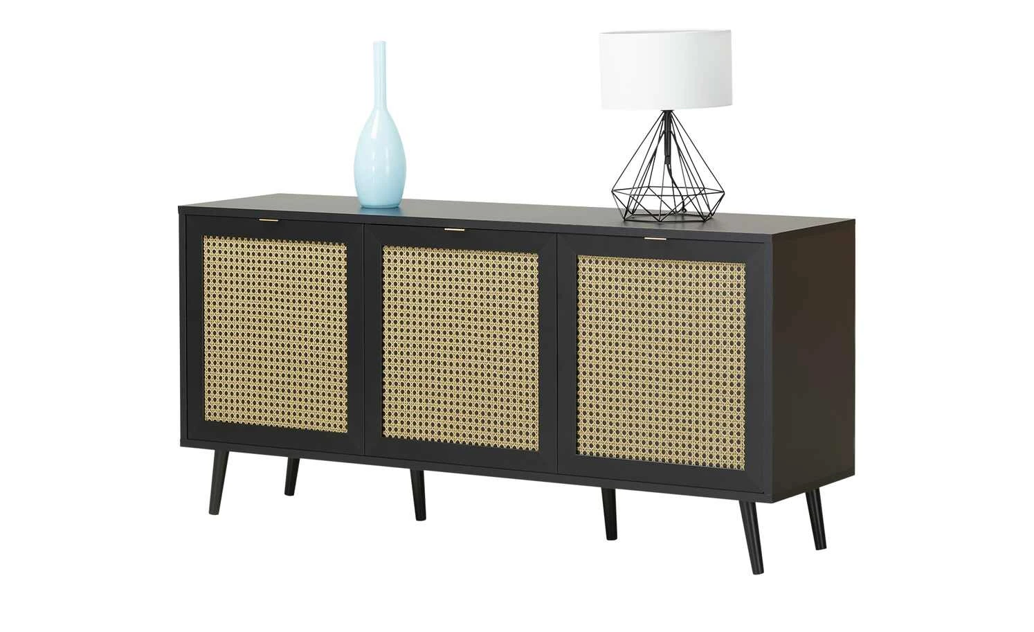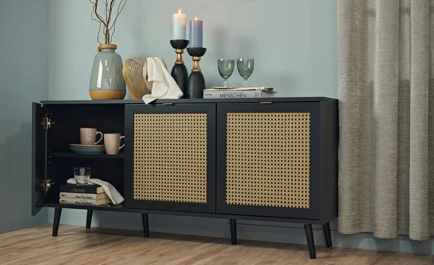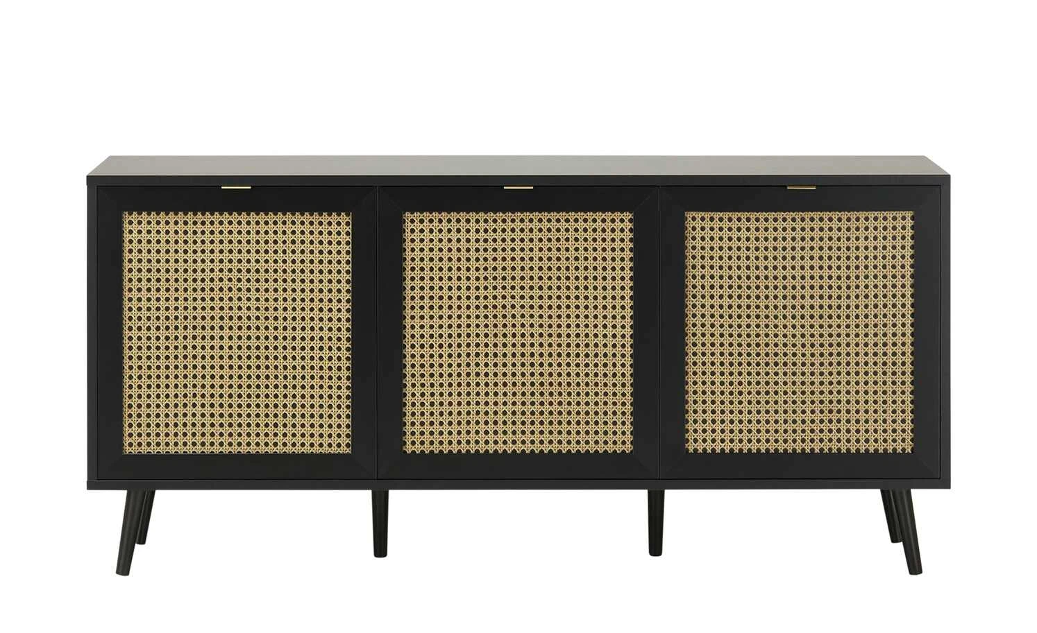 Zeitloses Schwarz in Kombination mit hellen Fronten in Wiener-Geflecht-Optik: Das ist das Sideboard Vienna. Zusammen mit den schräg zulaufenden Buchenfüßen in schwarz erzeugt sie ein edles Kaffeehaus-Flair. Hinter den drei Türen befinden sich sechs Fächer, in denen Sie allerlei Dinge unterbringen können. Auch die 150 x 40 Zentimeter große Oberfläche bietet viel Platz für Dekoobjekte oder Tischlampen.