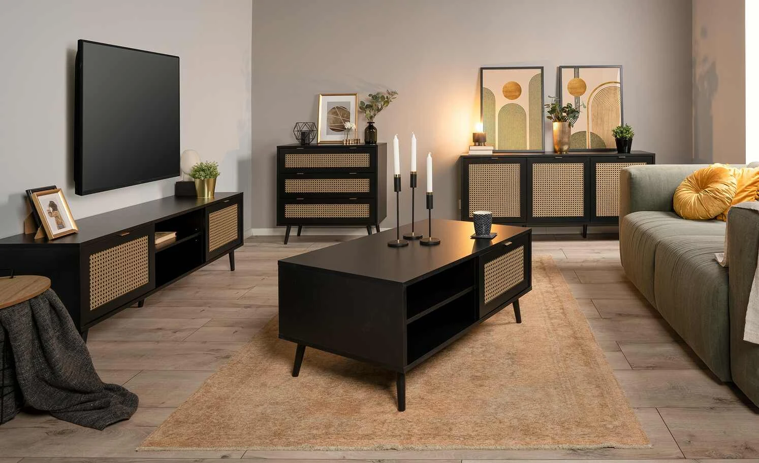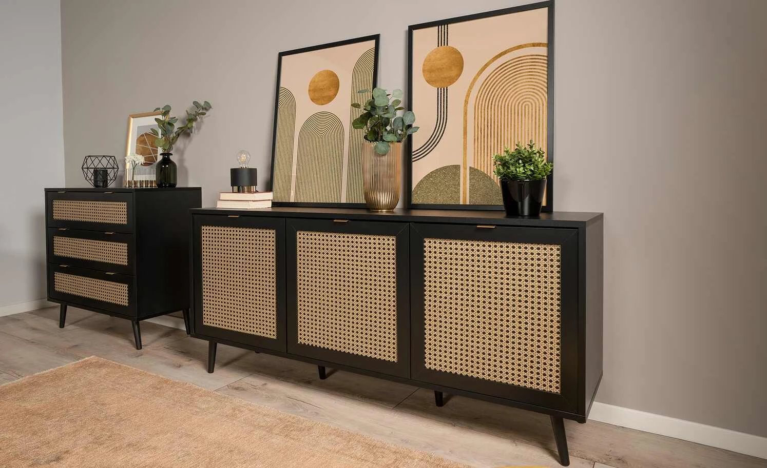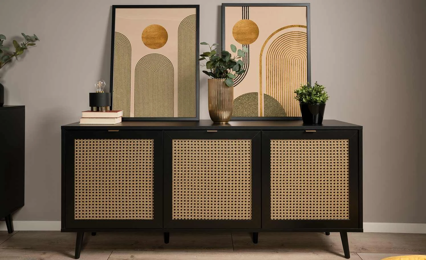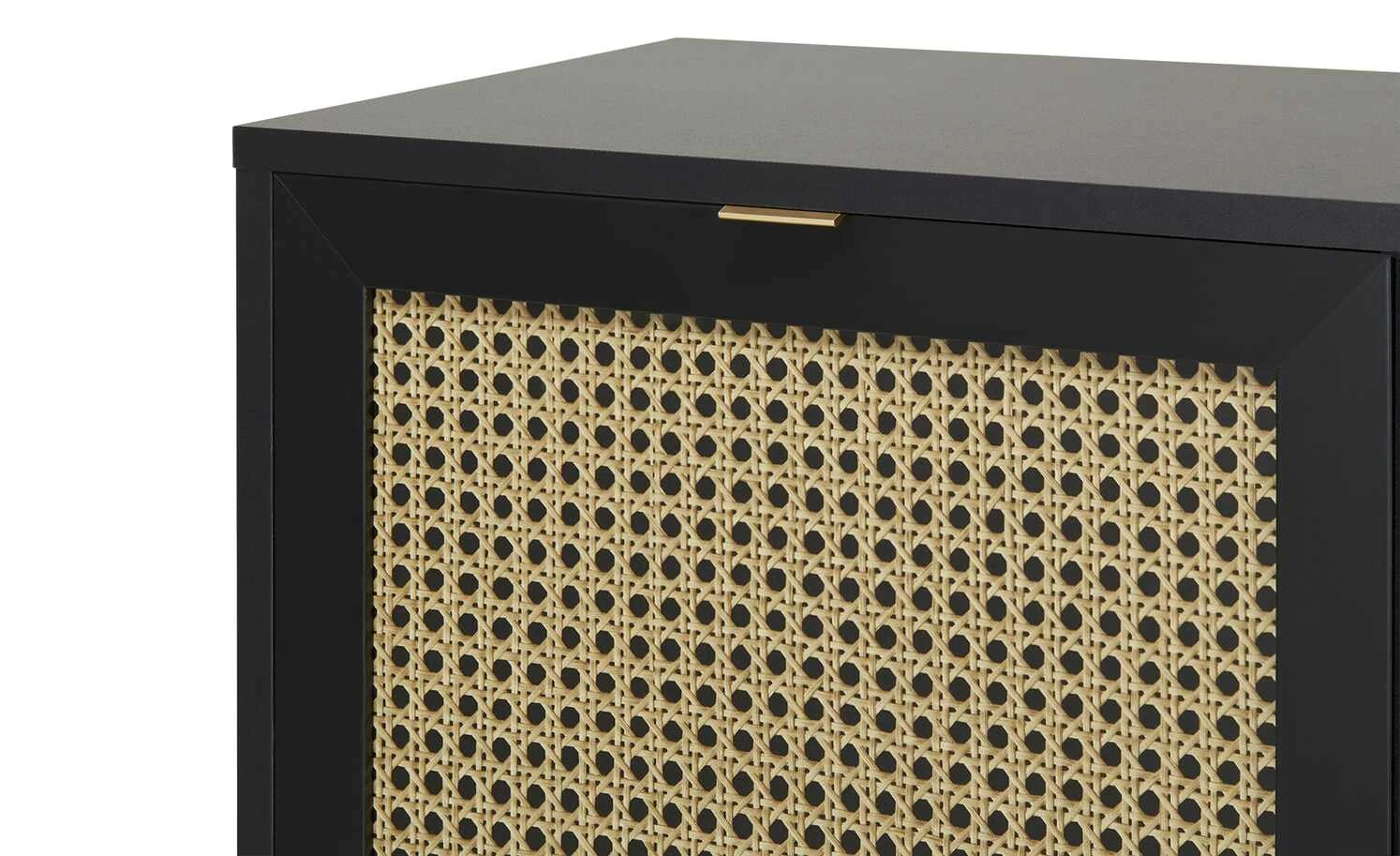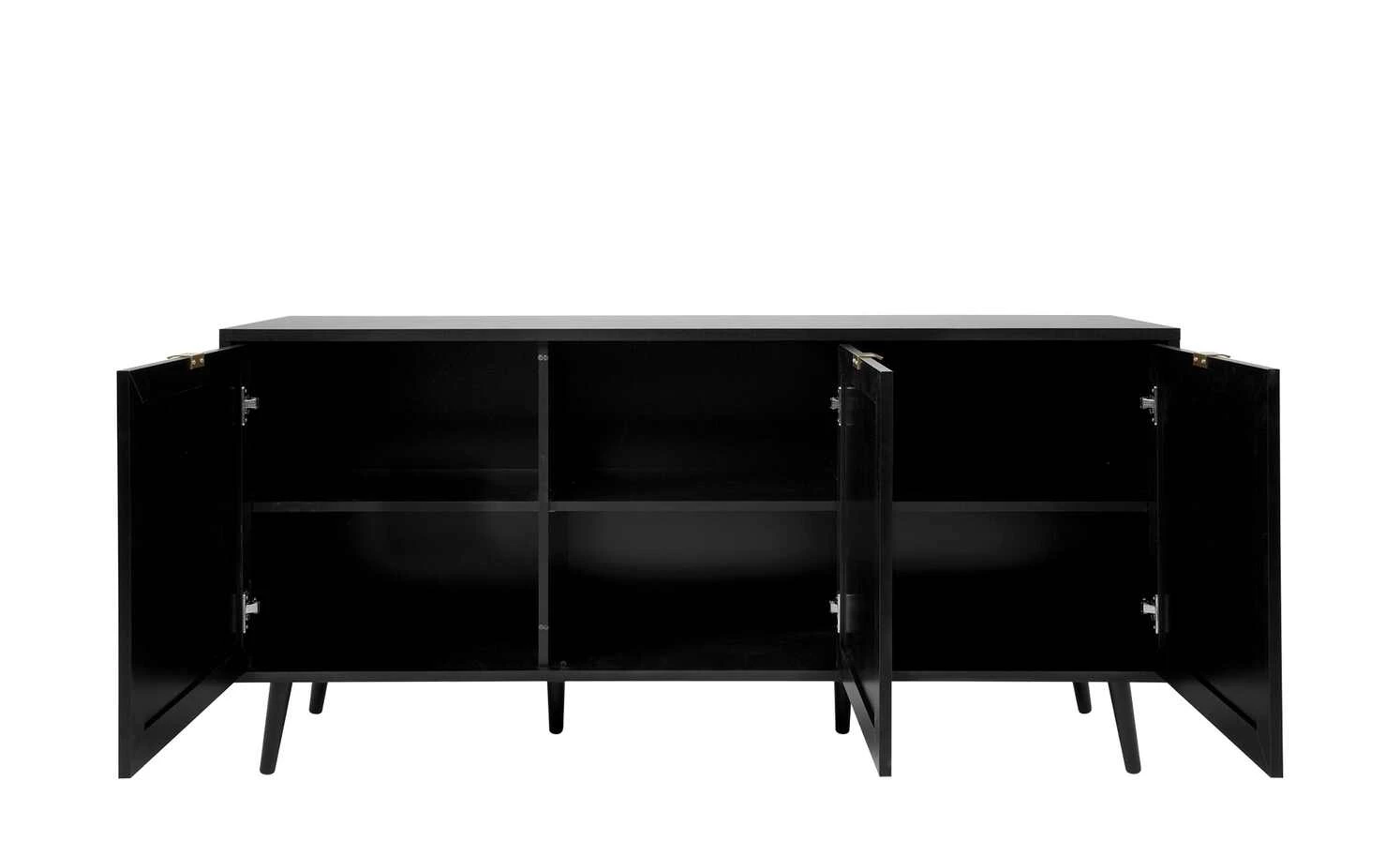 Zeitloses Schwarz in Kombination mit hellen Fronten in Wiener-Geflecht-Optik: Das ist das Sideboard Vienna. Zusammen mit den schräg zulaufenden Buchenfüßen in schwarz erzeugt sie ein edles Kaffeehaus-Flair. Hinter den drei Türen befinden sich sechs Fächer, in denen Sie allerlei Dinge unterbringen können. Auch die 150 x 40 Zentimeter große Oberfläche bietet viel Platz für Dekoobjekte oder Tischlampen.