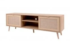Das TV-Lowboard Vienna fällt durch die serientypischen Fronten in Wiener-Geflecht-Optik sofort ins Auge. Der ansonsten schwarze Fernsehschrank wird durch die helle Foto-Folie an den beiden Türen gekonnt akzentuiert. Platzieren Sie auf dem TV-Board Fernseher bis zu 65 Zoll auf der pflegeleichten Oberfläche und verstauen Sie Fernsehzubehör ganz einfach hinter den beiden Türen oder in den zwei offenen Fächern. Zwei messingfarbene Griffe komplettieren das Design. Die fünf Buchen-Massivholzfüße sorgen für einen festen Stand.