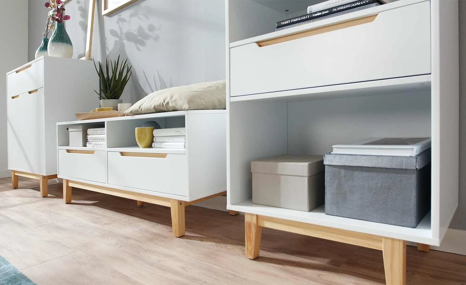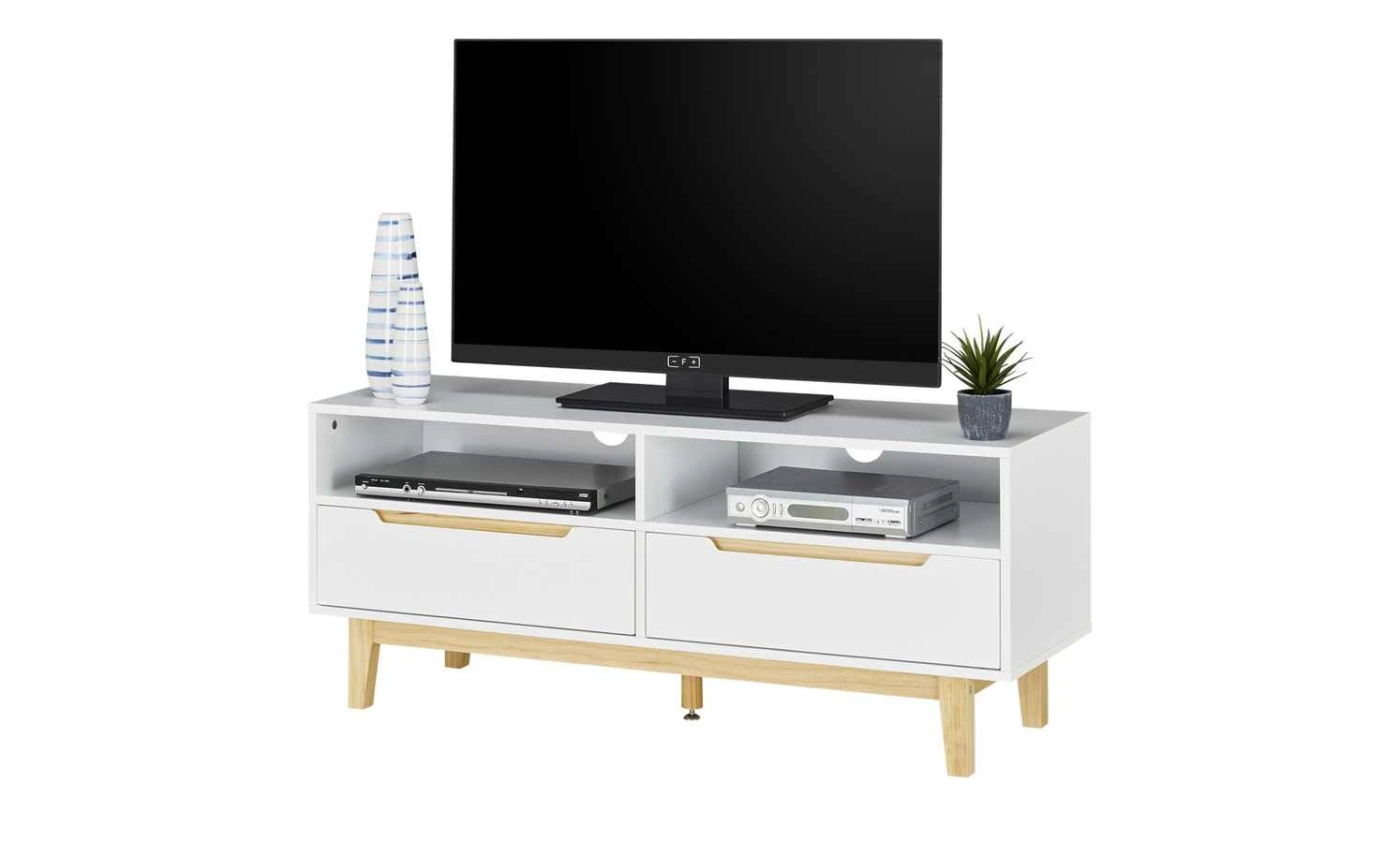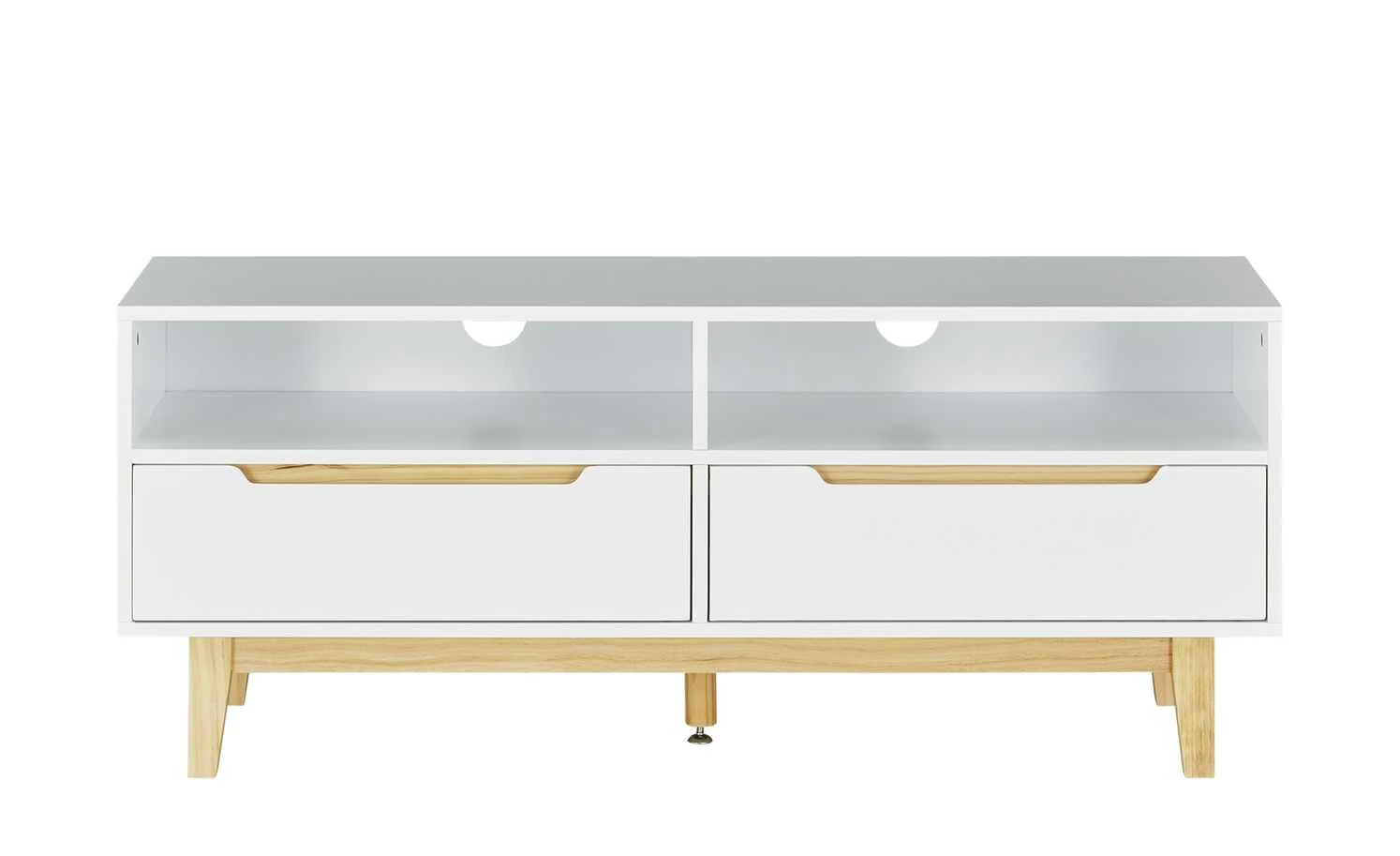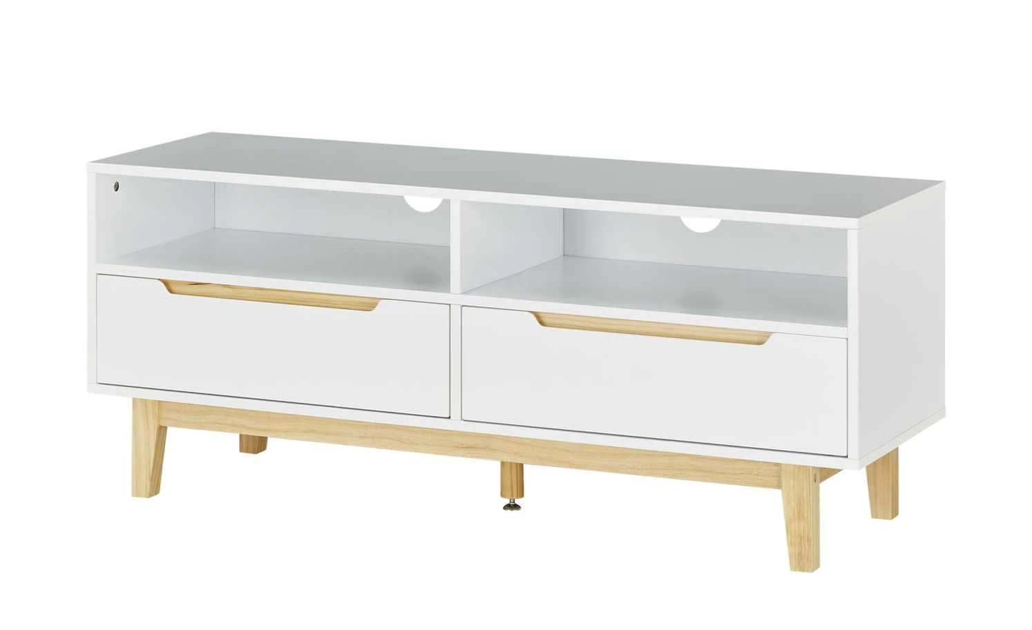 Das TV-Lowboard Brescia vereint praktischen Nutzen und skandinavisches Design. Front und Korpus sind in schönem Weiß lackiert. Für Akzente sorgen die Absetzungen aus massiver Kiefer Natur. Sie befinden sich an der Front und auch das Gestell greift den Holzlook auf. Damit die Kiefer gut geschützt ist, wurde sie mit einem speziellen Lack behandelt. Dank der neutralen Lackfarbe, ist die natürliche Holzmaserung dabei aber erhalten geblieben. Brescia verfügt über eine 120 Zenitmeter breite Stellfläche für Ihren Fernseher. Direkt darunter sind zwei Gerätefächer mit Kabeldurchlass zu finden. Stauraum steht Ihnen in zwei Schubladen zur Verfügung.