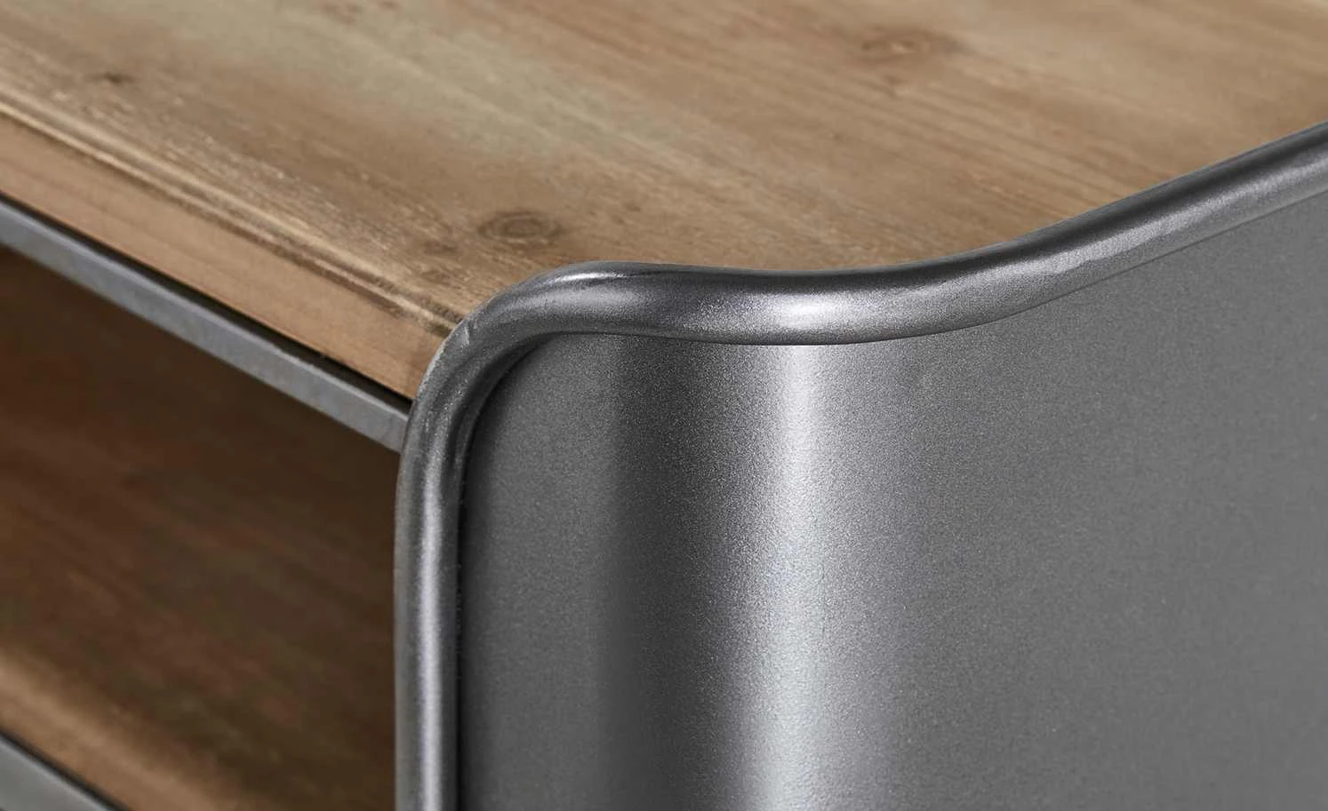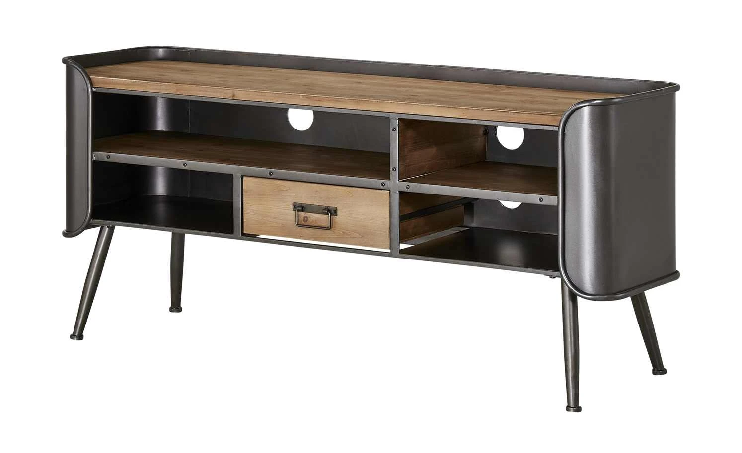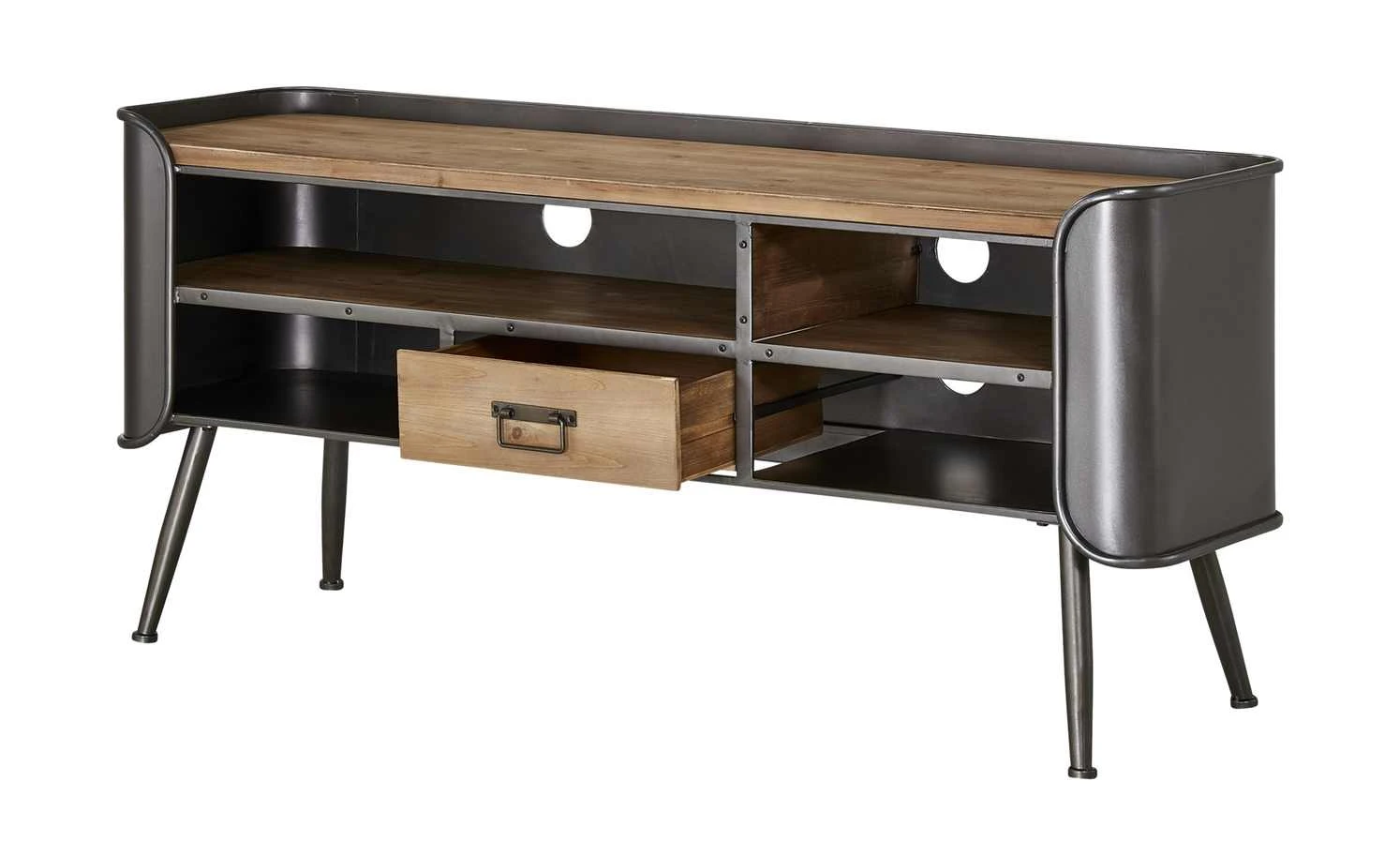 Beim TV-Lowboard Imola harmonieren rostfarbenes Metall und gemasertes Kiefernholz gekonnt miteinander. Die beiden Materialien werden durch bewusst gesetzte Used-Effekte akzentuiert, sodass ein ganz besonderer Industrial-Charme entsteht. Unter der 140 Zentimeter langen Holzfläche für Ihren Fernsehbildschirm befinden sich vier offene Fächer und ein Schubfach mit Massivholz-Front. Jedes der offenen Fächer ist mit einem Kabeldurchlass versehen, damit Sie Receiver und Co. ganz nach Ihren Wünschen platzieren können.