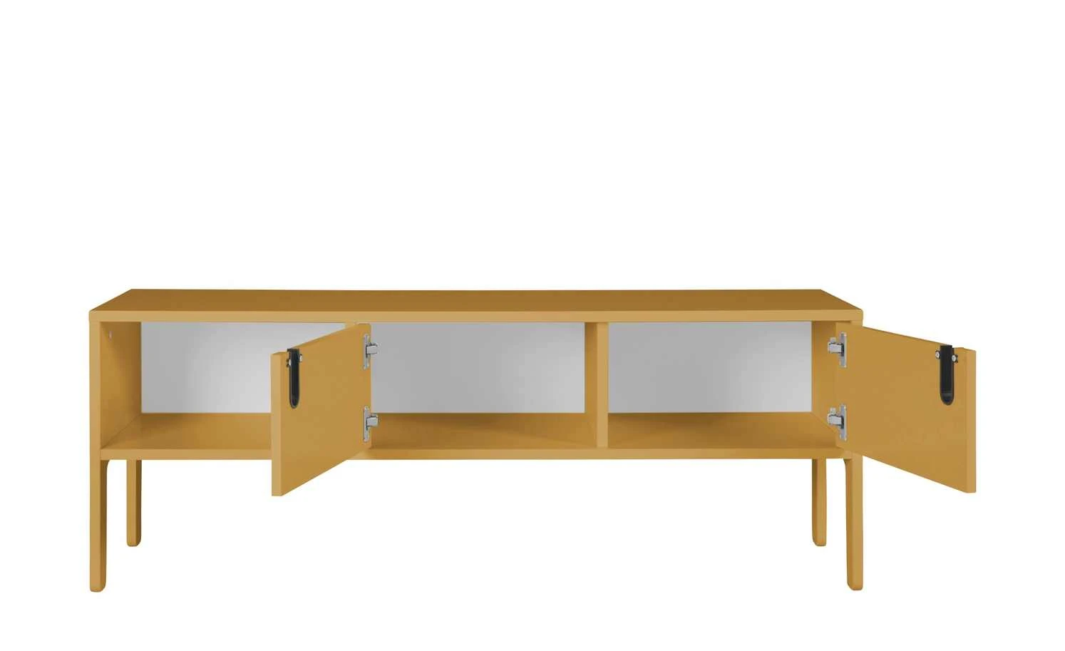 Auf dem TV-Lowboard Uno kommt Ihr Fernseher wunderbar zur Geltung. Das stylische Lowboard ist als Teil der Serie Uno mit dem German Design Award Special 2019 ausgezeichnet worden. Der Mix aus einer zurückhaltenden Linienführung und der modernen Farbe spricht für sich. Der senfgelbe Lack hat einen matten Look, was die Farbe edel akzentuiert. Die sichtbare Rückwand setzt sich in Weiß davon ab. Neben der breiten Stellfläche bietet Uno ein offenes Fach und Stauraum hinter zwei Türen. Die Rückwand ist mit einem Kabeldurchlass ausgestattet.