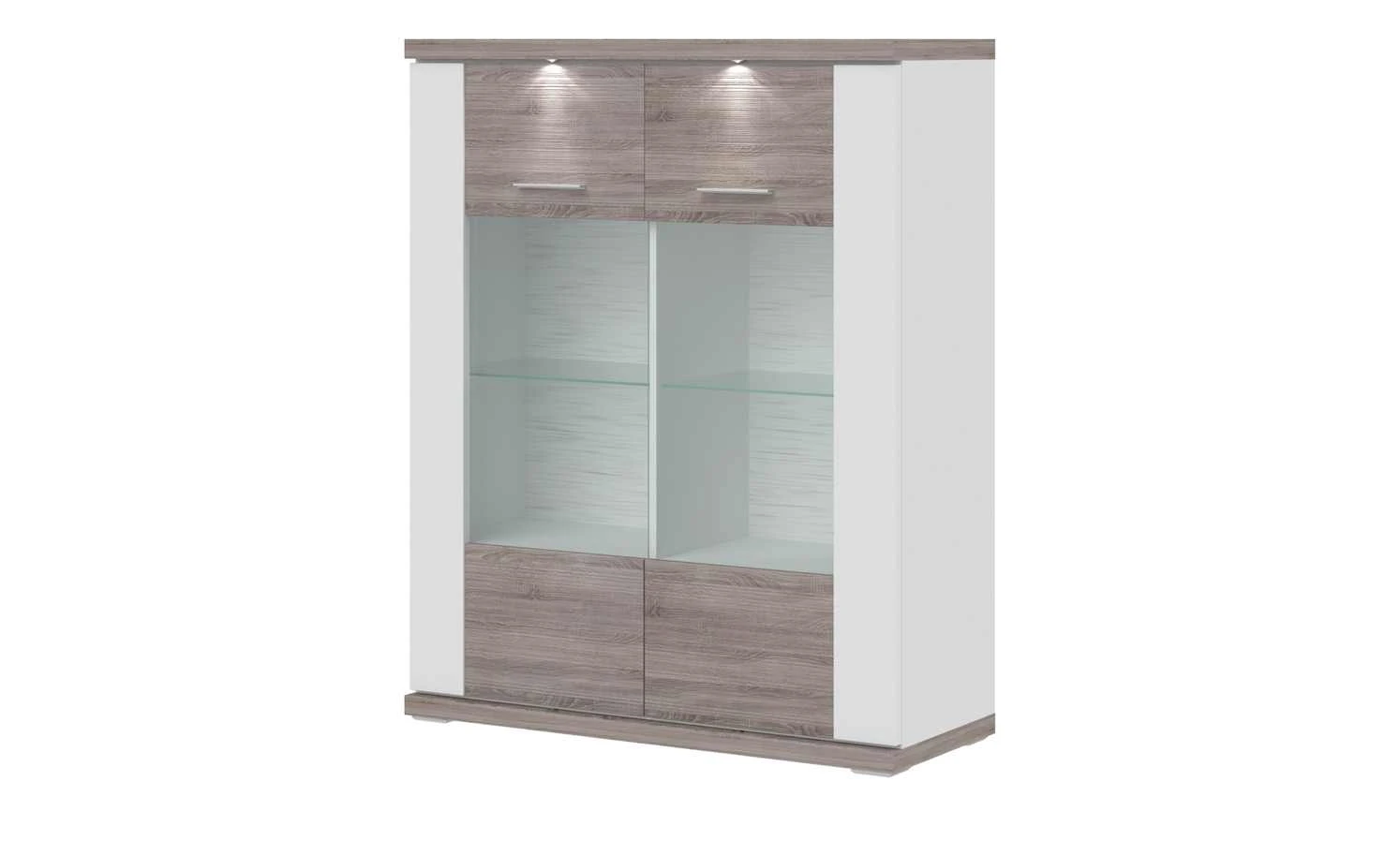 Hinter den beiden Türen bietet Titan viel Platz. Das Highboard hat vier Fächer, in die Sie durch die Glasabsetzungen der Türen schauen können. Darüber hinaus bietet Titan ihnen vier weitere Fächer, die nicht einsehbar sind. Die dunkel abgesetzten Fronten und die sichtbaren Rückwände sind mit einer Schropphobelung versehen worden. Titan wird mit einer Beleuchtung geliefert.