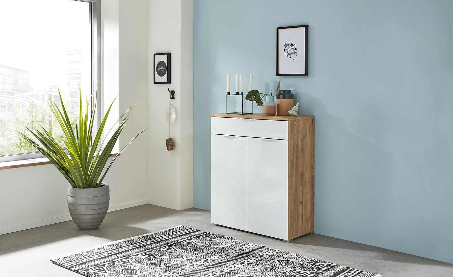 Stylisches Design und Funktionalität vereinen sich in der Kommode Bent von uno. Der Korpus ist in rustikaler Navarra Eiche (Nachbildung) gehalten. Die weiße Front setzt sich davon dekorativ ab. Sie ist aus Glas und hat einen leichten Glanz. Er hebt das Weiß hervor. Das Sicherheitsglas ist robust und kratzerunempfindlich – so wie auch der Korpus. Er ist mit strapazierfähigem Melamin beschichtet. Bent verfügt über eine Schublade und zwei Türen. Dahinter befinden sich zwei Fächer mit jeder Menge Stauraum.